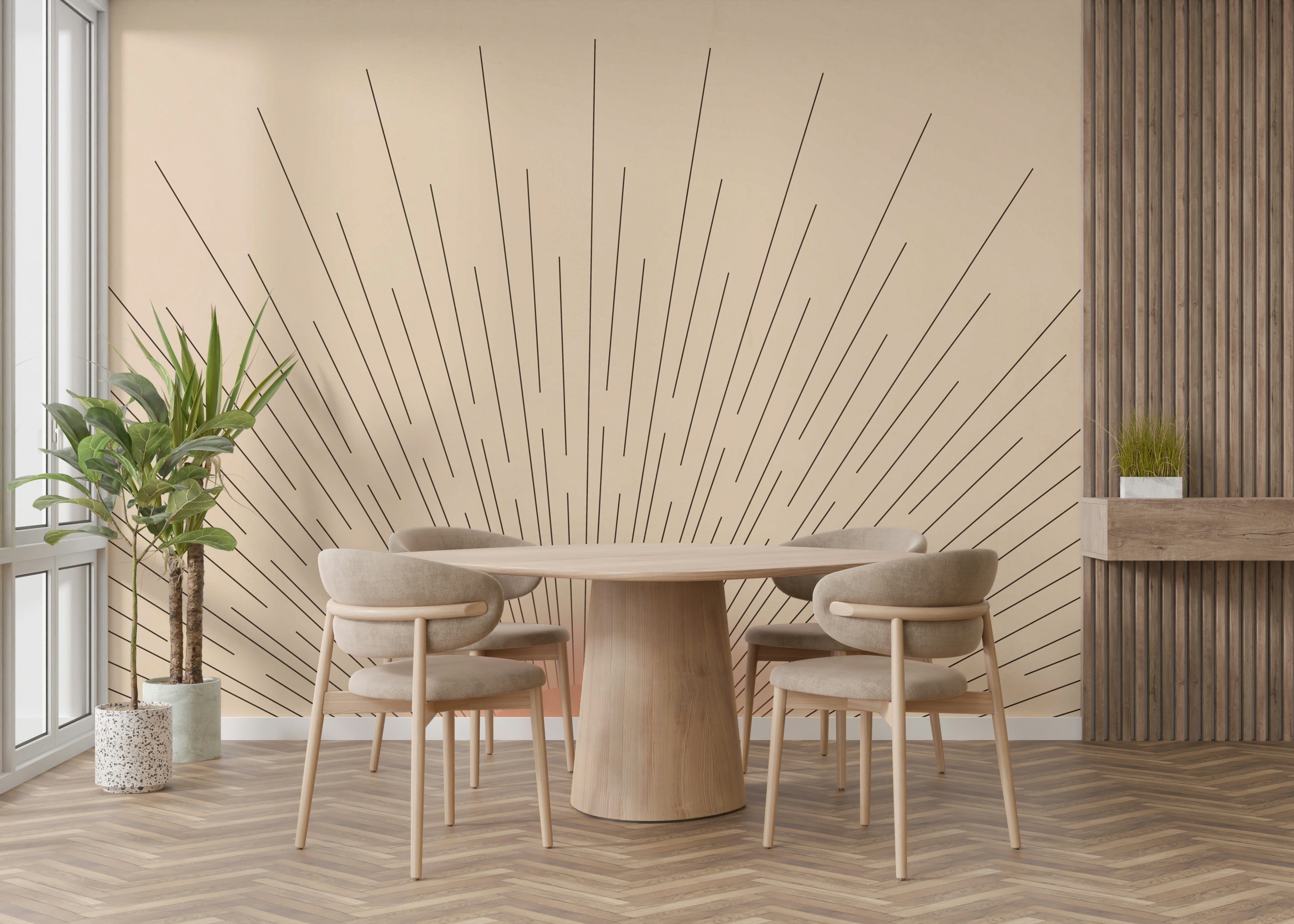 This wallpaper captures the essence of mid-century modern design with its clean lines and warm color palette. The radiating lines create a dynamic sunburst effect, while the muted coral and beige tones offer a sense of calm and sophistication. This design is both visually appealing and versatile, making it suitable for a variety of spaces, from living rooms and bedrooms to hallways and even offices. The geometric simplicity ensures it won't overpower the room, allowing other design elements to shine through. Its understated elegance adds a touch of retro charm without feeling dated.