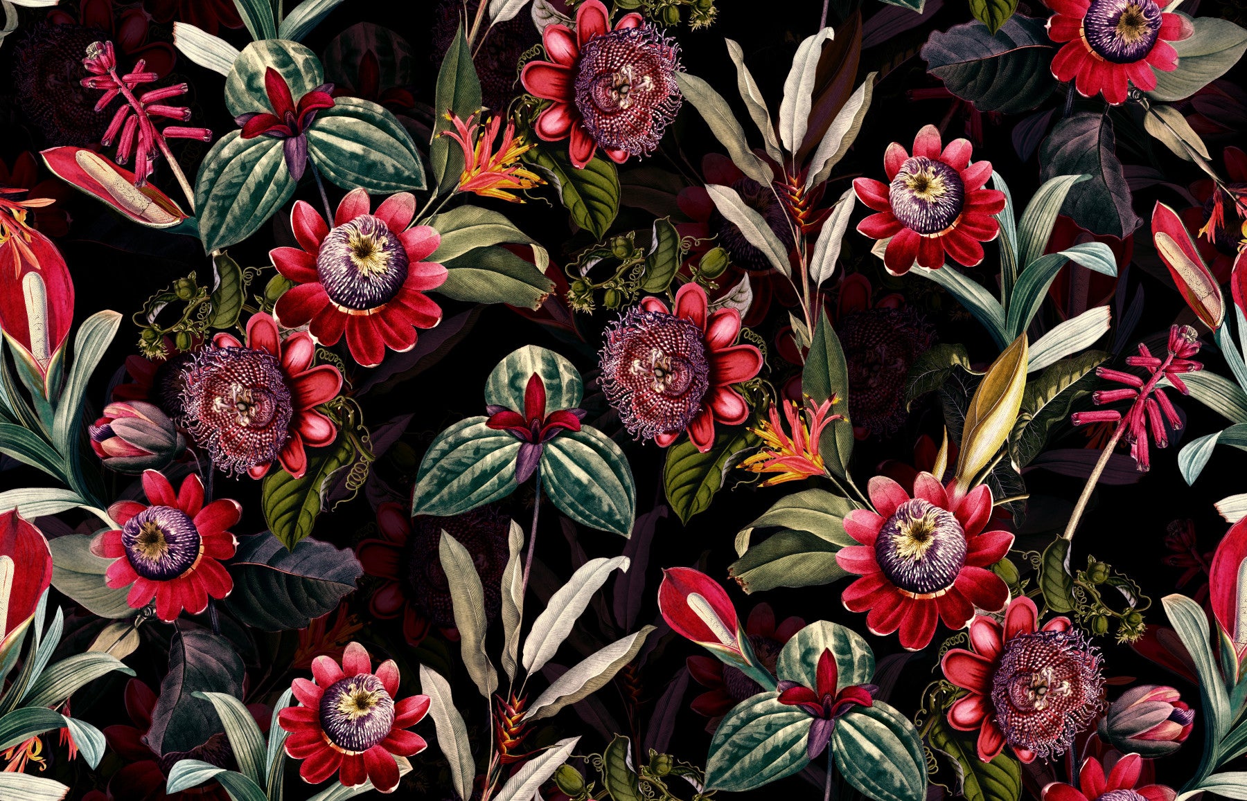 Bold floral wallpaper mural with deep colors and lush greenery.