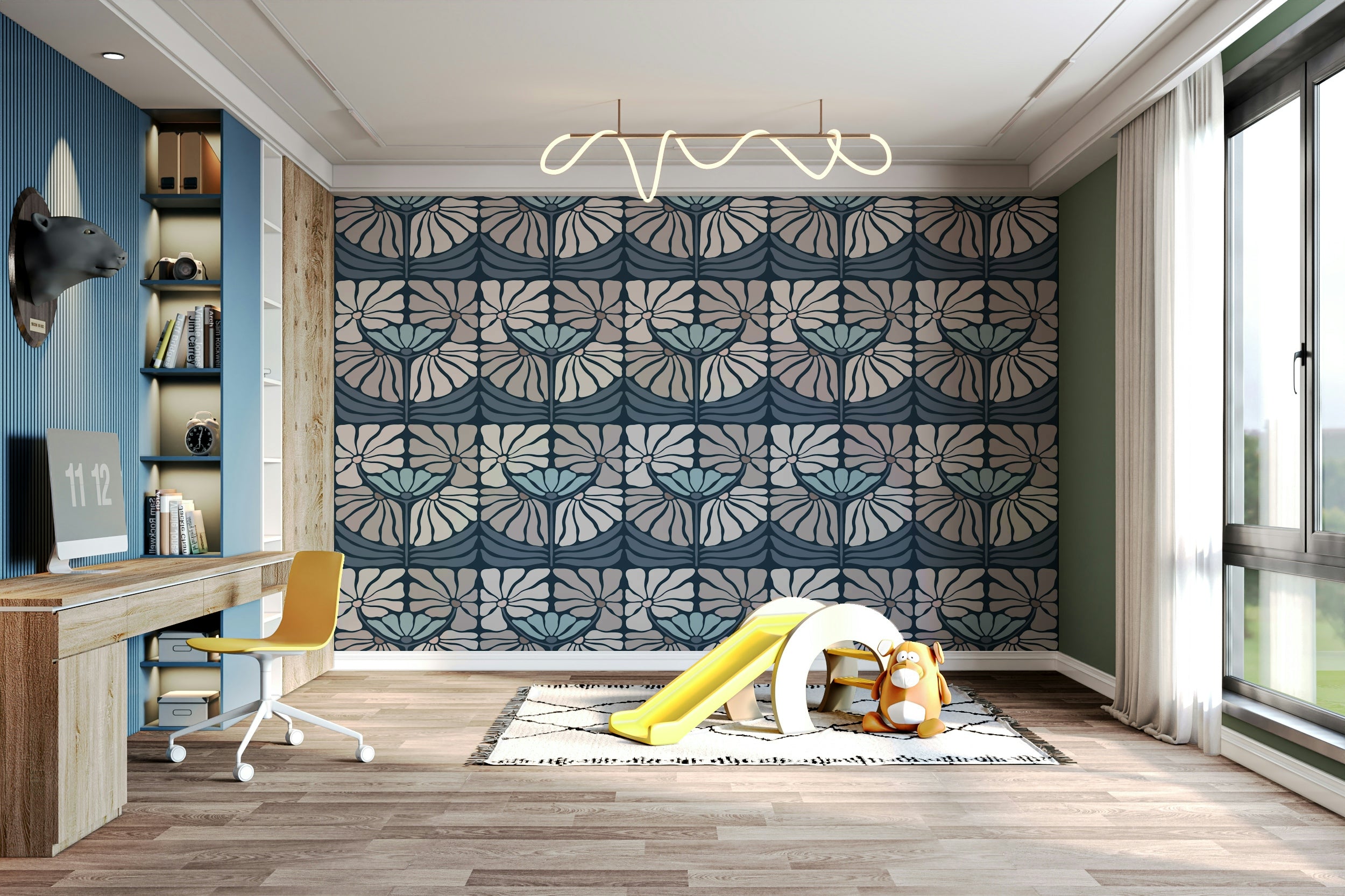 Midnight-themed wallpaper with bold botanicals