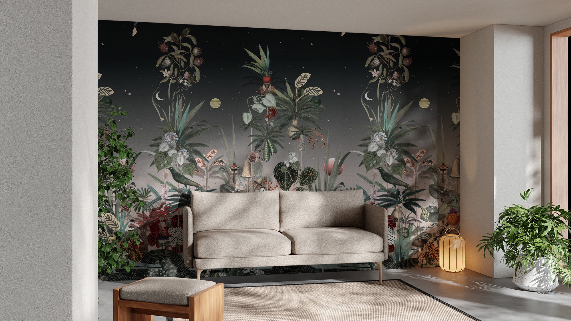 Luxurious botanic wall mural adding charm to a modern living room.