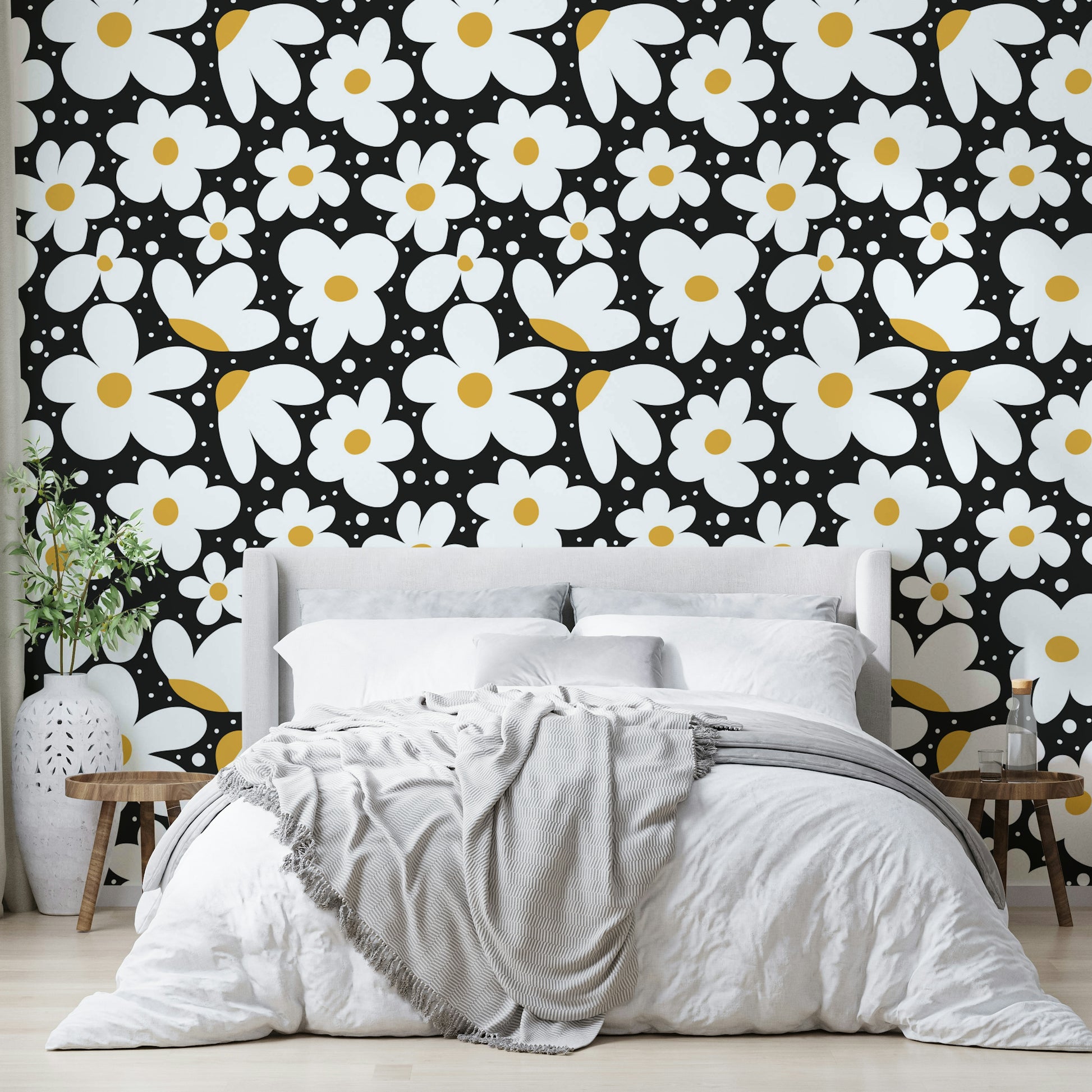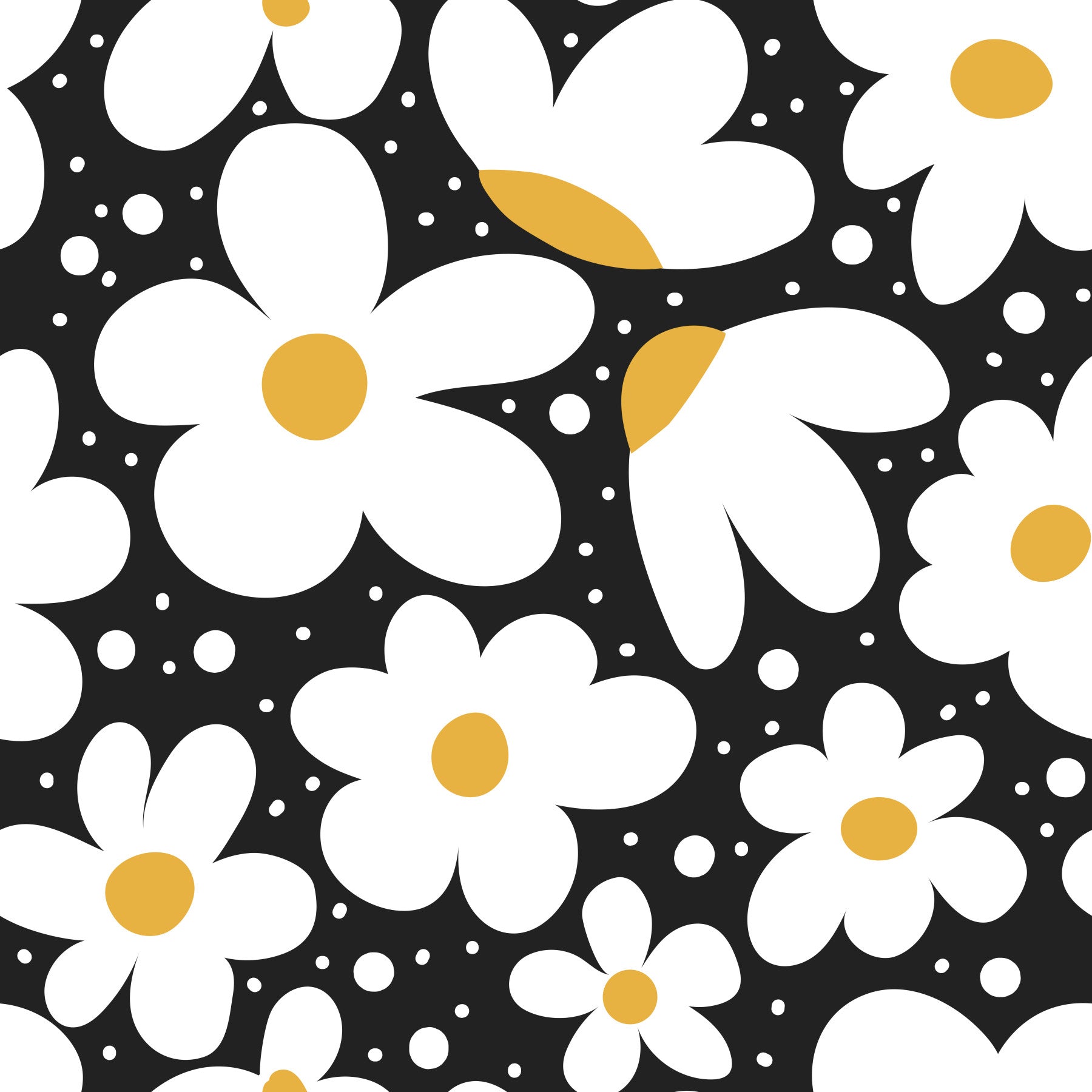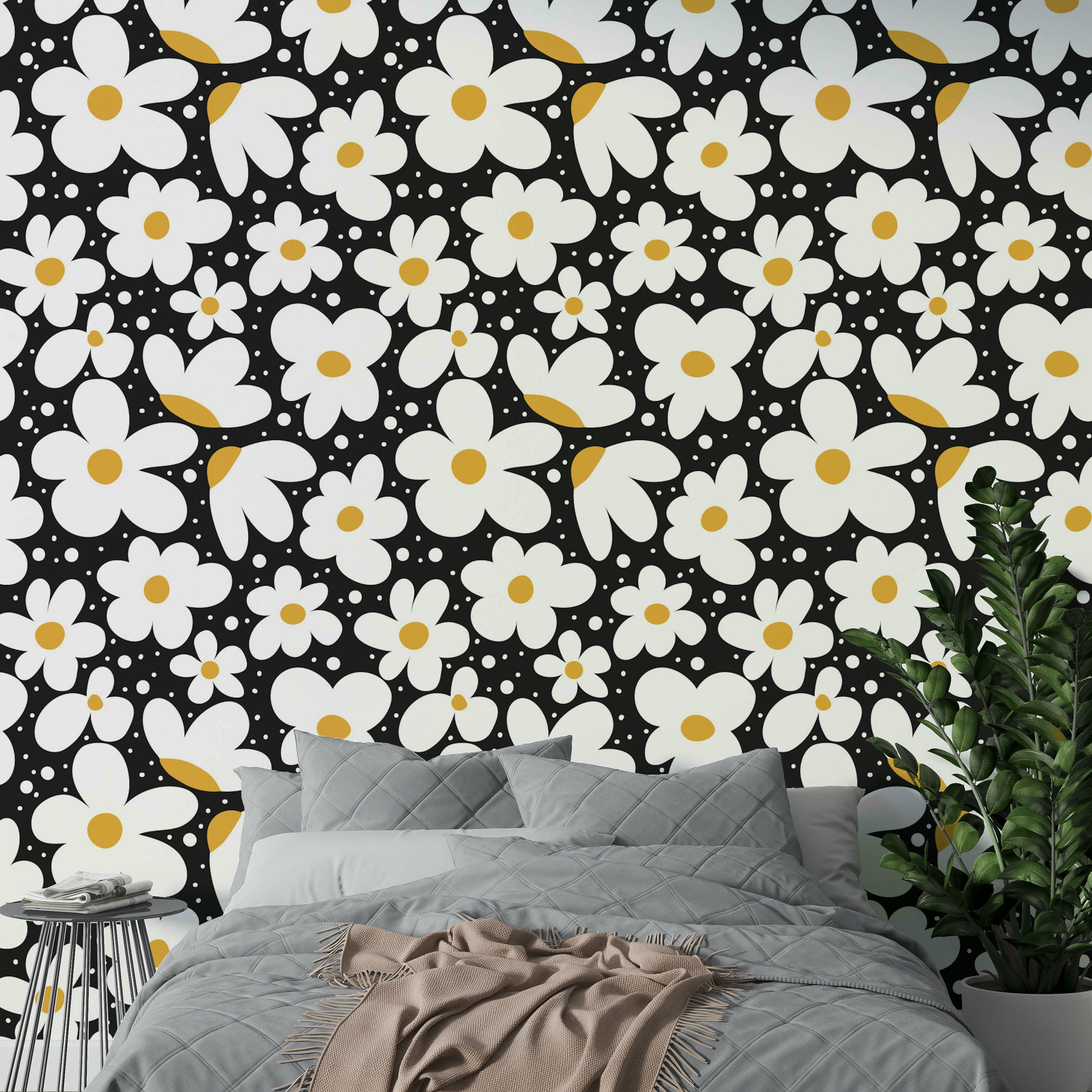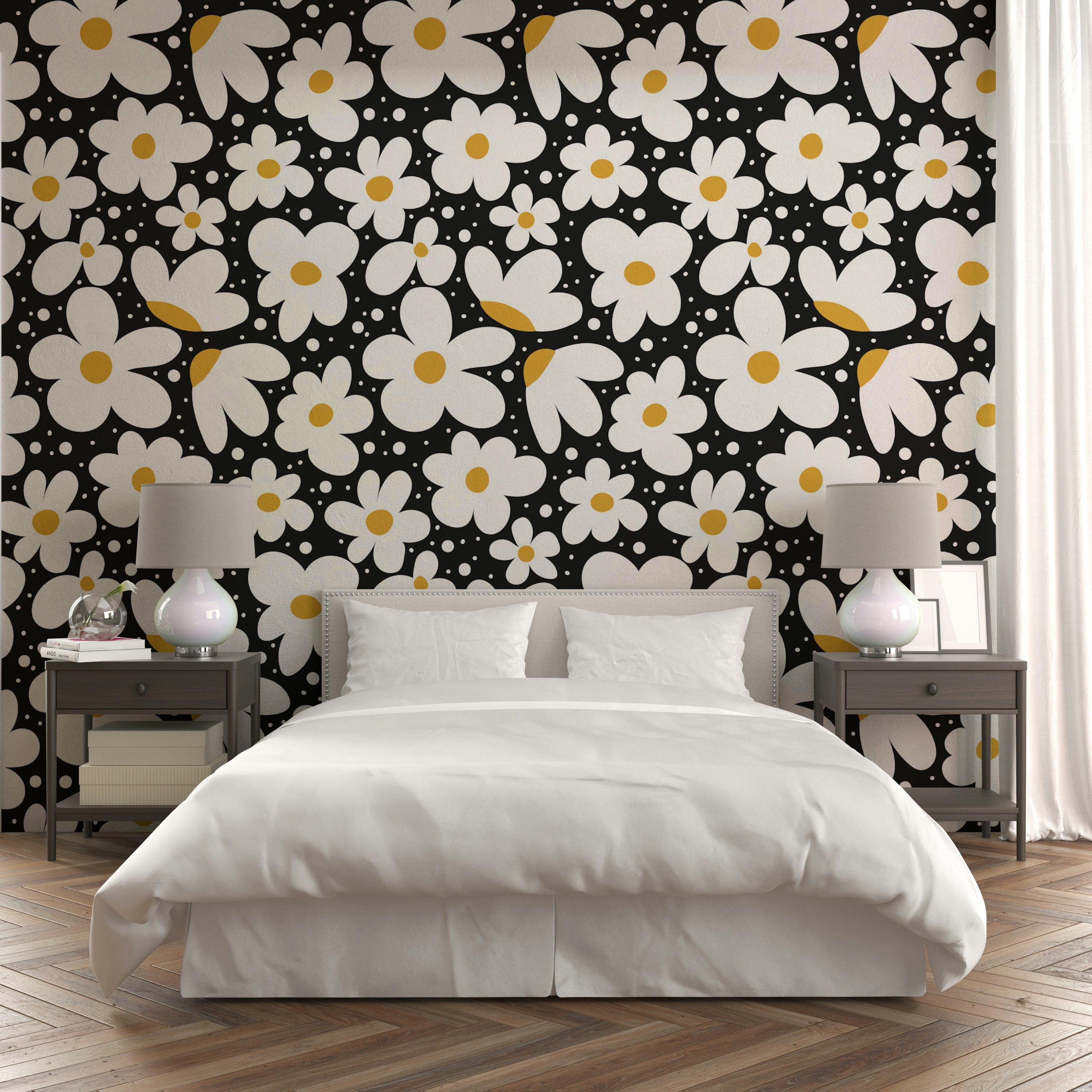 Embrace the enchanting allure of 'Midnight Daisies,' a captivating wallpaper design. Bold, stylized white daisies with sunny yellow centers bloom vibrantly against a deep black background, punctuated by playful white polka dots. This striking contrast creates a mesmerizing visual rhythm, perfect for adding a touch of whimsical sophistication to your digital space. The graphic simplicity of the design blends retro aesthetics with modern flair, offering a unique and eye-catching backdrop for your screen. Experience the magic of midnight blooms with this stunning and elegant wallpaper.