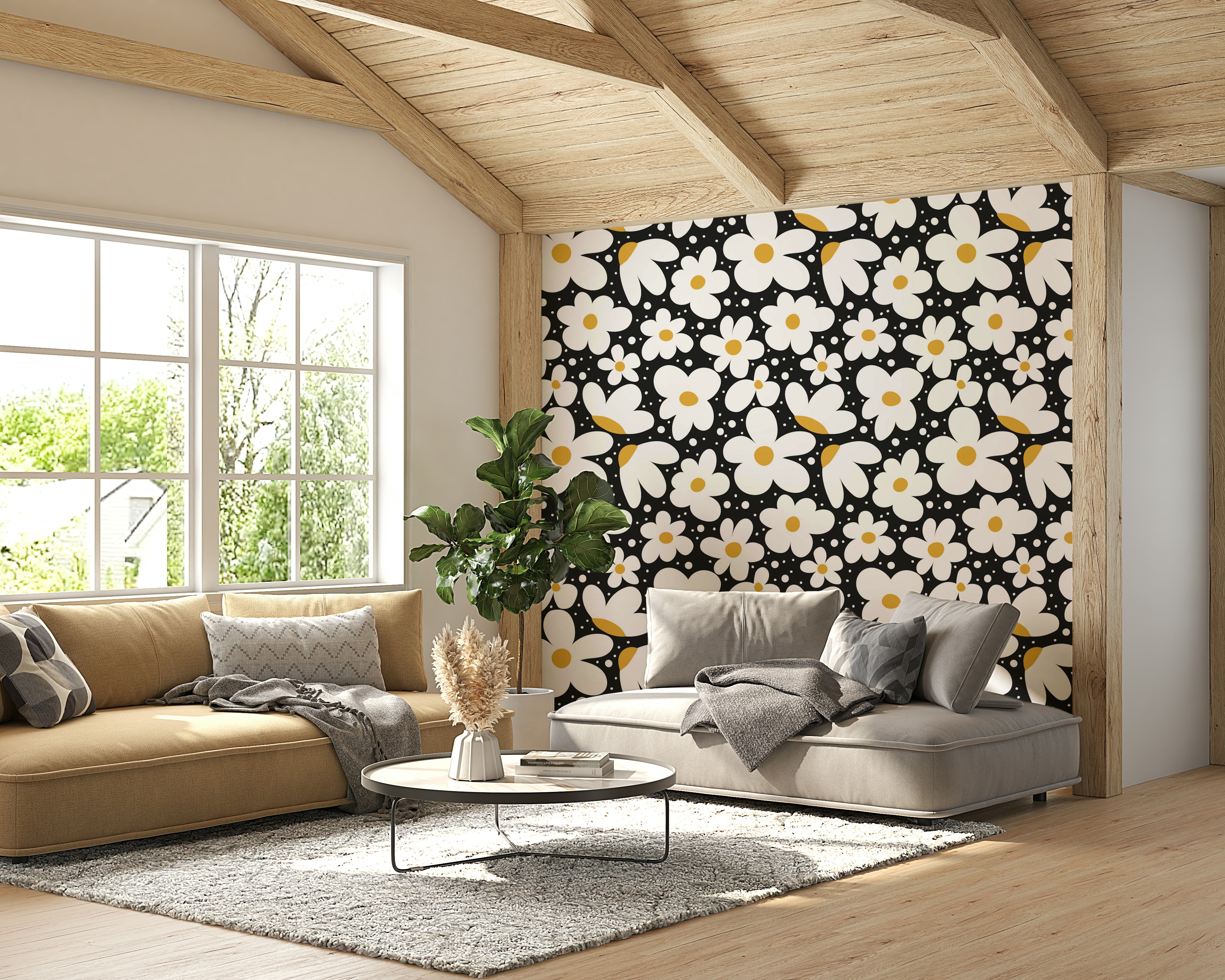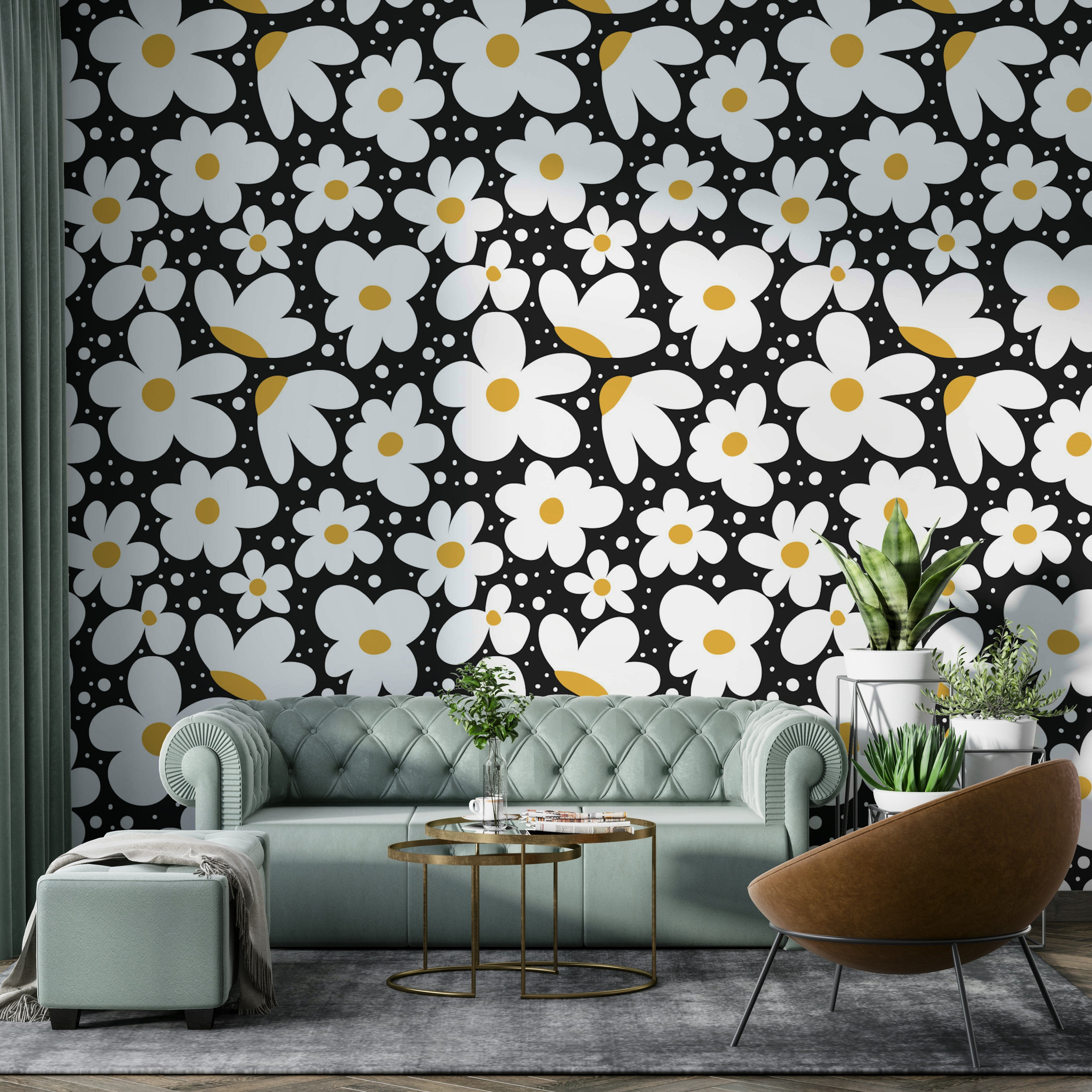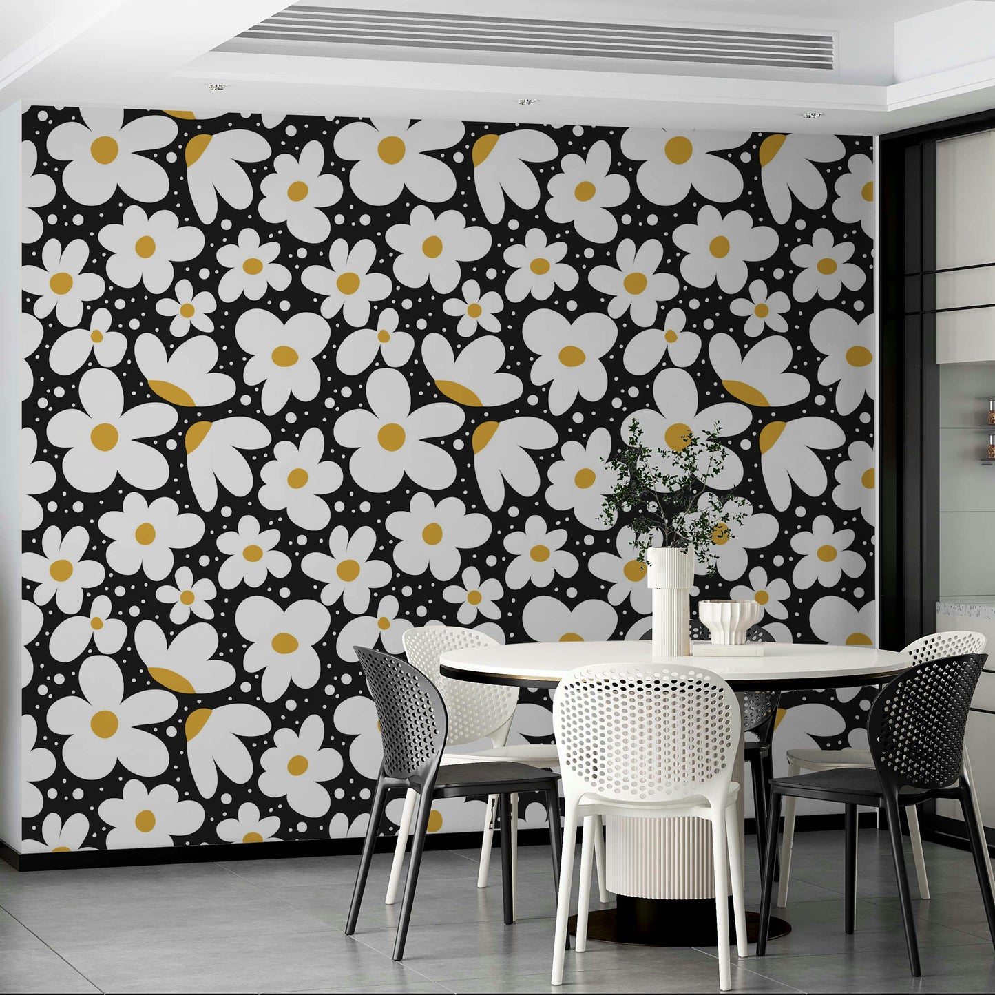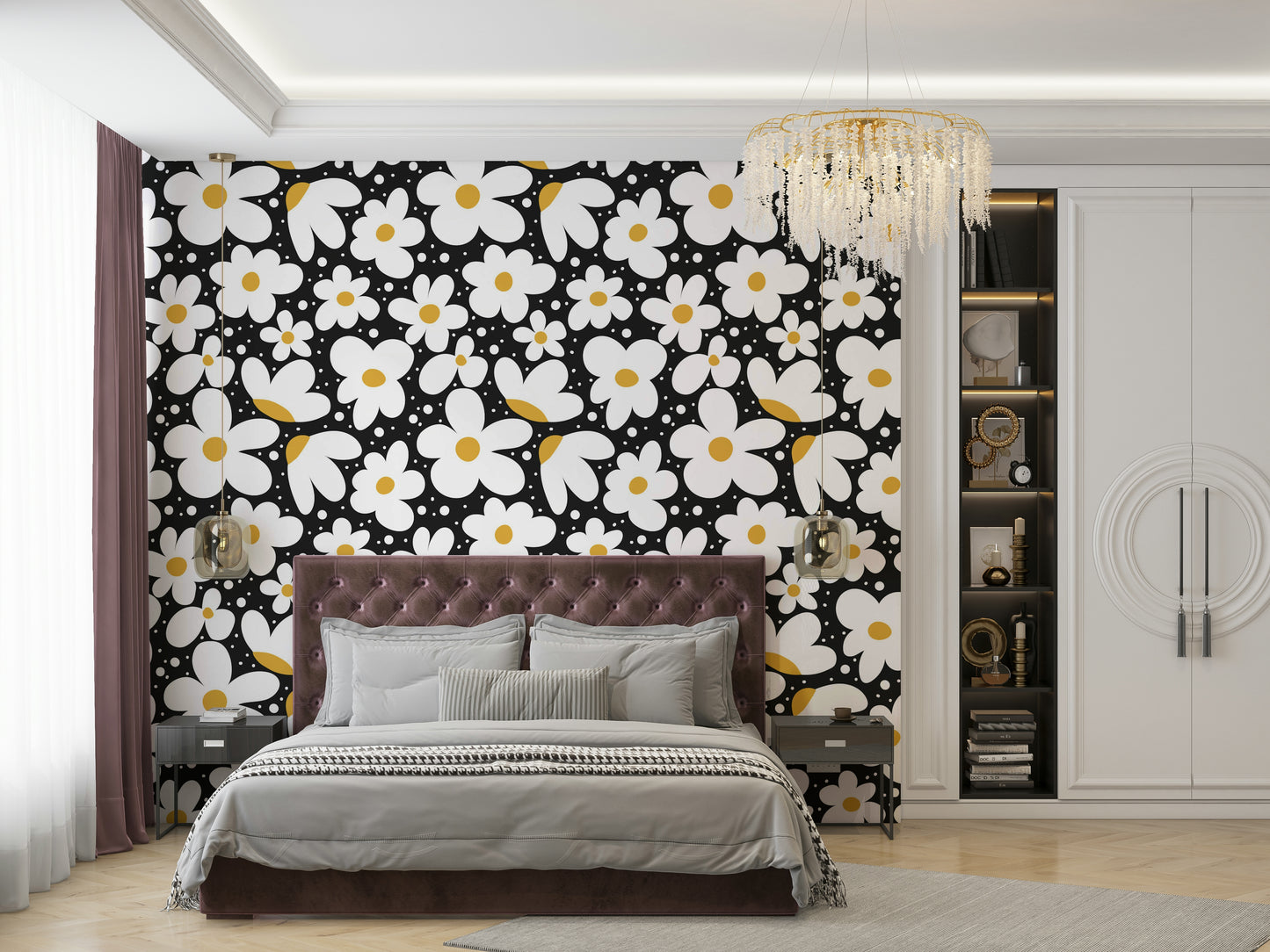 Embrace the enchanting allure of 'Midnight Daisies,' a captivating wallpaper design. Bold, stylized white daisies with sunny yellow centers bloom vibrantly against a deep black background, punctuated by playful white polka dots. This striking contrast creates a mesmerizing visual rhythm, perfect for adding a touch of whimsical sophistication to your digital space. The graphic simplicity of the design blends retro aesthetics with modern flair, offering a unique and eye-catching backdrop for your screen. Experience the magic of midnight blooms with this stunning and elegant wallpaper.