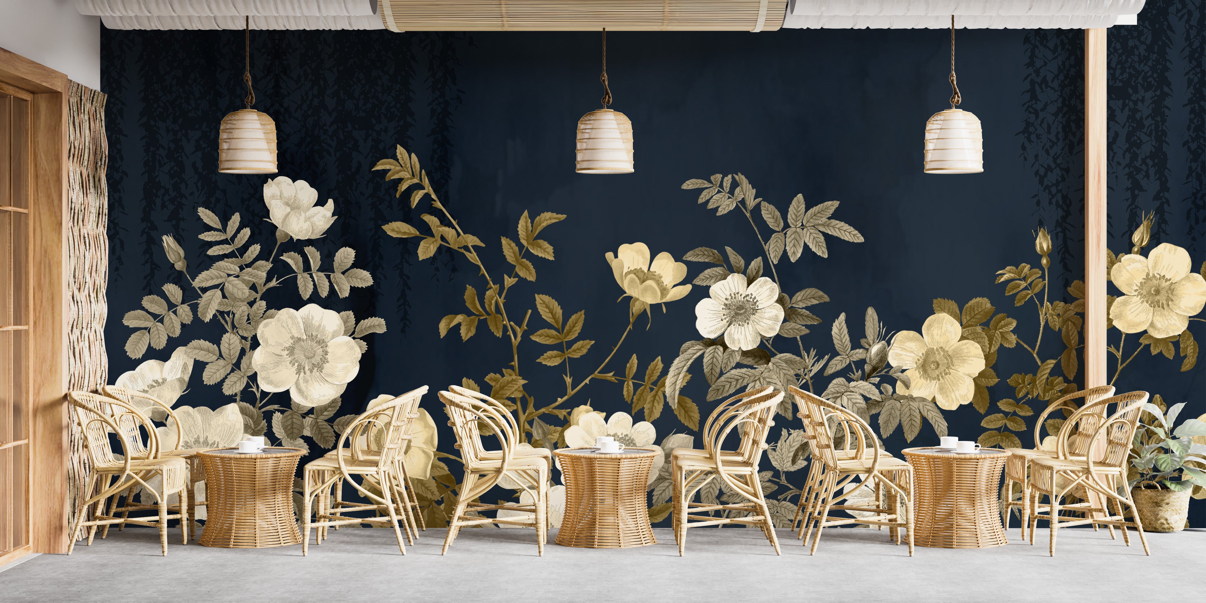 Midnight wallpaper mural with intricate gold flora accents.