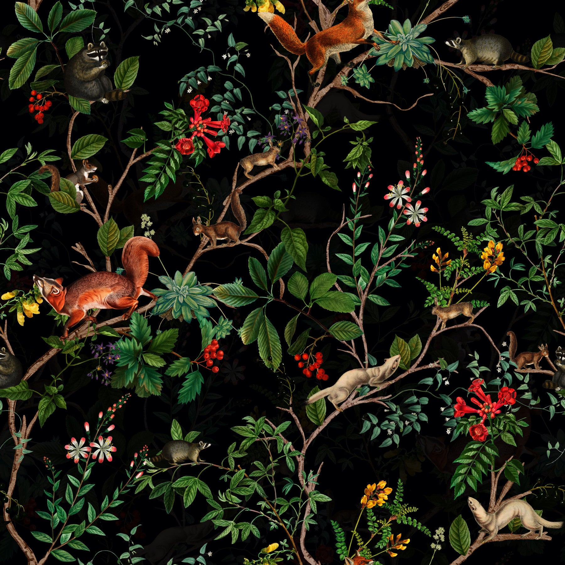 Transform your space with this dramatic woodland wallpaper by Uta Naumann for walls, featuring charming critters nestled amidst a canopy of lush greenery and vibrant florals against a deep black backdrop. Foxes, squirrels, and raccoons frolic among climbing vines and vivid red and yellow blossoms. The design brings an element of the enchanted forest into bedrooms, living rooms, or dining areas, especially suiting spaces where a touch of elegant whimsy is desired. It also makes a dramatic statement in hallways or entryways.
