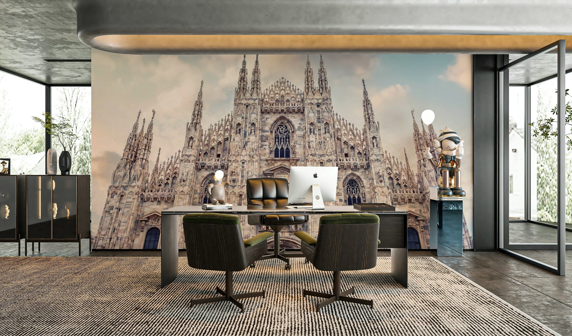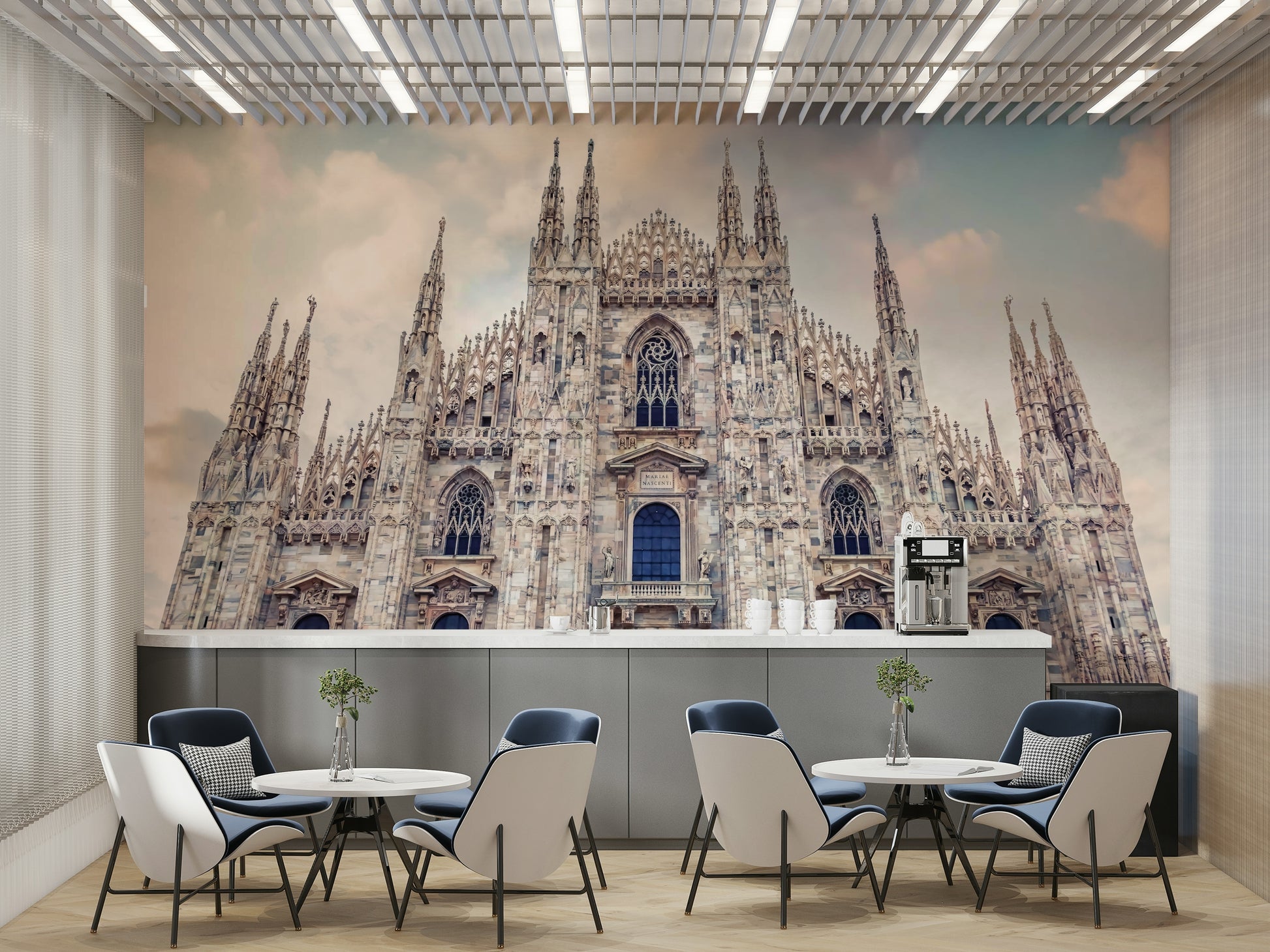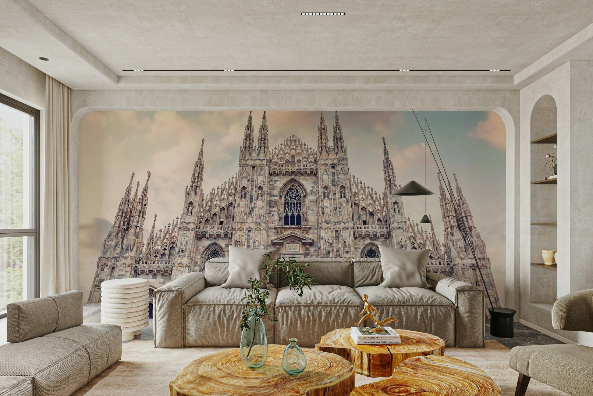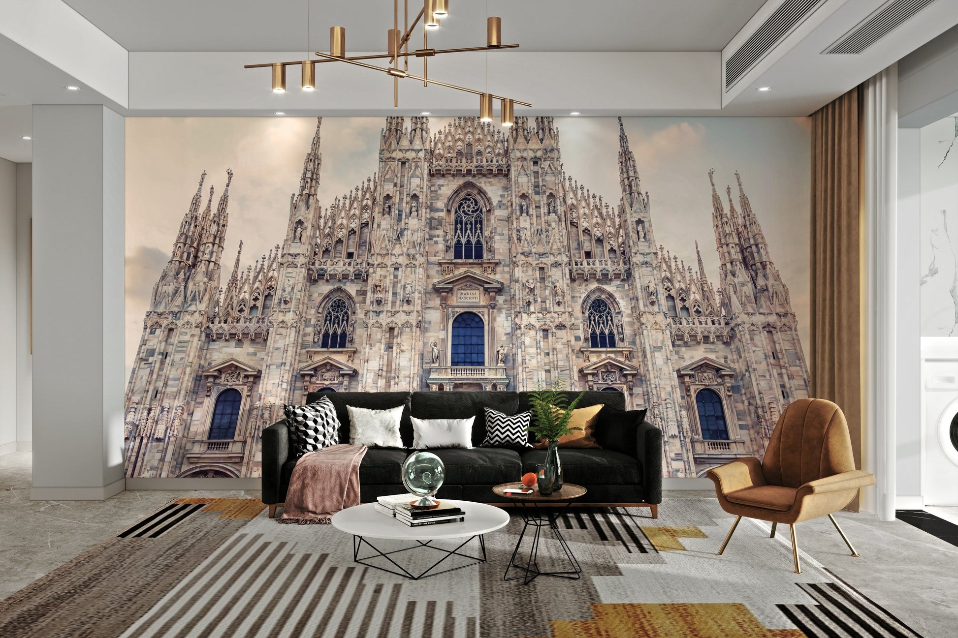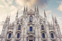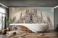 This wallpaper showcases the grandeur of Milan Cathedral with its intricate Gothic architecture reaching towards a soft, cloud-dusted sky. The design features neutral tones that blend effortlessly, bringing a touch of European elegance to your space. Use this wallpaper for walls to add a sophisticated backdrop to living rooms, bedrooms, or hallways. Its calming colour palette and historical charm also make it an excellent choice for a home office or library.