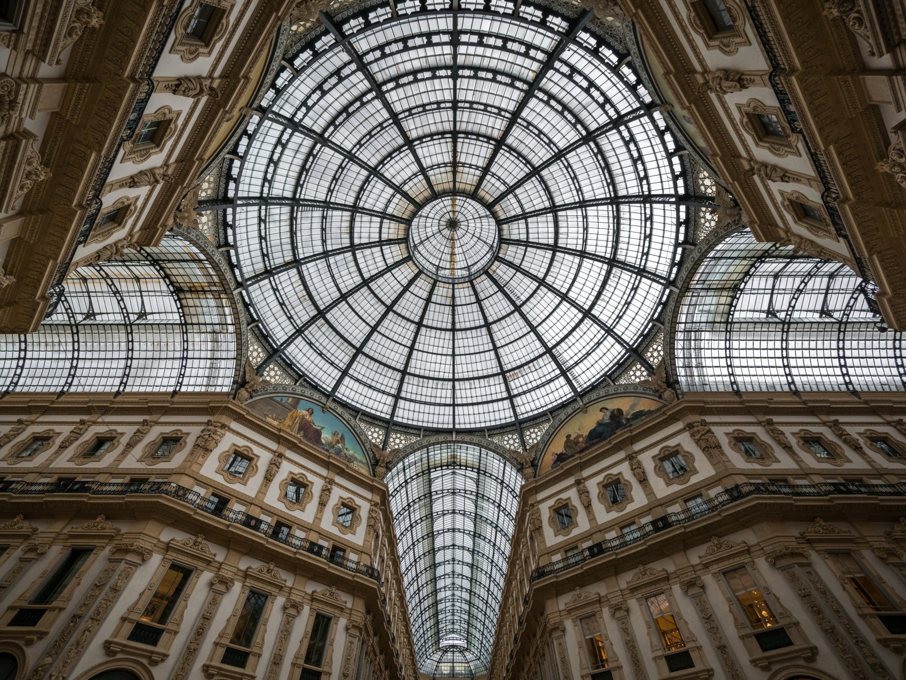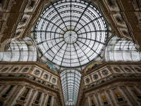 Elevate your space with this wallpaper featuring the magnificent dome of Milan's Galleria. The symmetrical design, highlighted with beige tones, gives a sophisticated look to any room. This opulent wallpaper for walls adds a touch of elegance to the living room, bedroom, or office. Its grand style and neutral colours create a balanced ambiance, which enhances various interior schemes with its timeless charm and architectural splendour.