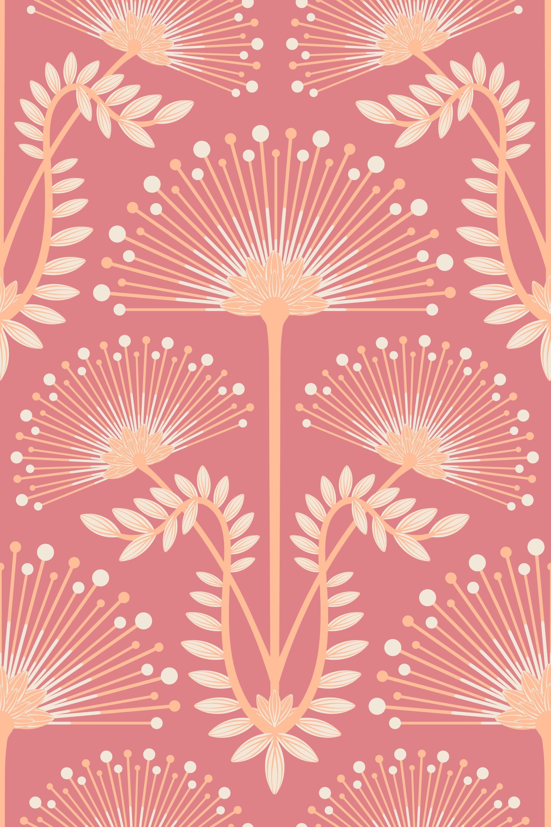 Mimosa Art Deco Floral Botanical Damask Pastel Peach Fuzz Orange Rust Red Wallpaper⁠
