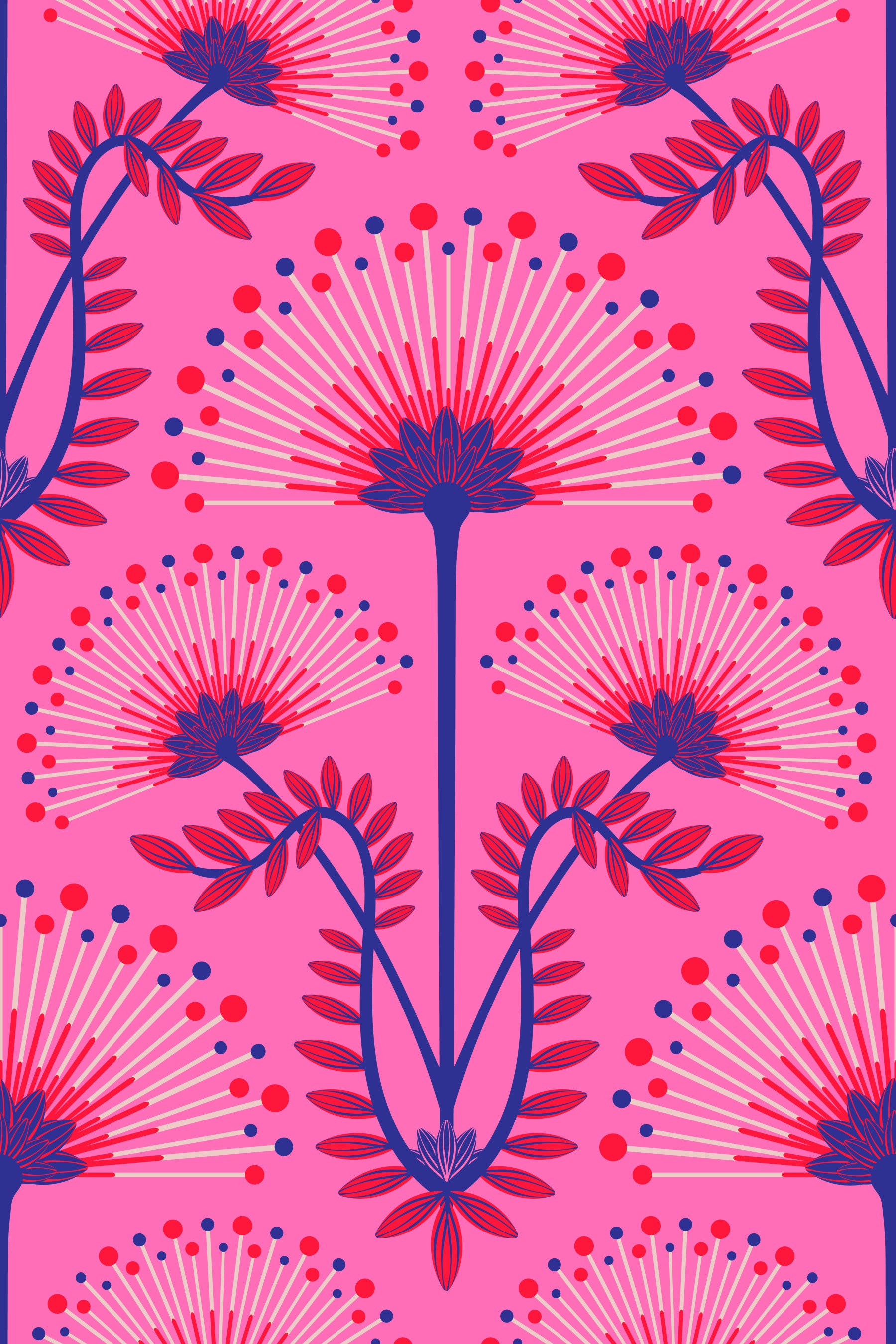Evoke the elegance of the Roaring Twenties and the Jazz Age with this Mimosa floral wallpaper. This Art Deco-inspired design features a striking botanical damask pattern, blending symmetrical flower motifs with geometric precision in a feminine palette of light pink, red and royal blue on a fuchsia hot pink background. Graceful mimosa blooms with radiating details and organic curving foliage bring a touch of nature and a visual rhythm to this pattern. A sophisticated and timeless choice, "Mimosa" adds a touch of vintage Hollywood girl glamour to any space while remaining contemporary and elegantly stylish. This pattern design is also available in Other Colourways too! Original wallpaper pattern design by Jackie Tahara of UnBlink Studio.