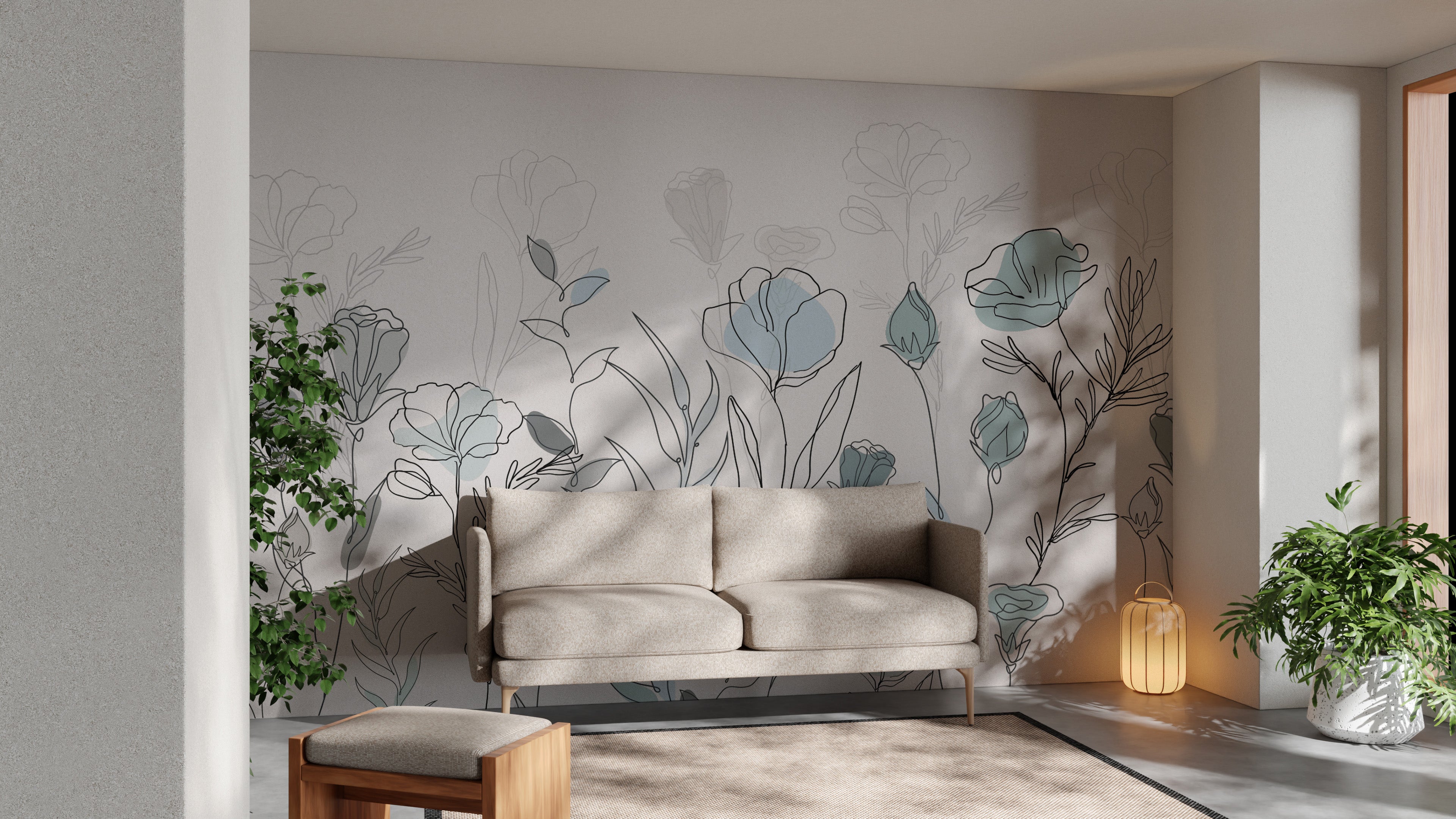 Bring a modern touch to any room with minimalist floral line art wallpaper. This design creates a serene atmosphere, featuring delicate hand-drawn flower wallpaper in soft pastel tones. The subtle abstract botanical wallpaper blends effortlessly with contemporary and classic interiors. Muted shades of blue and gray add a timeless appeal, making it a perfect choice for bedrooms, living areas, or workspaces. The modern floral wallpaper complements various color palettes while adding visual interest. Enhance walls with the beauty of elegant botanical murals for a refined and sophisticated look. This pastel flower wallpaper offers a seamless way to refresh interiors.