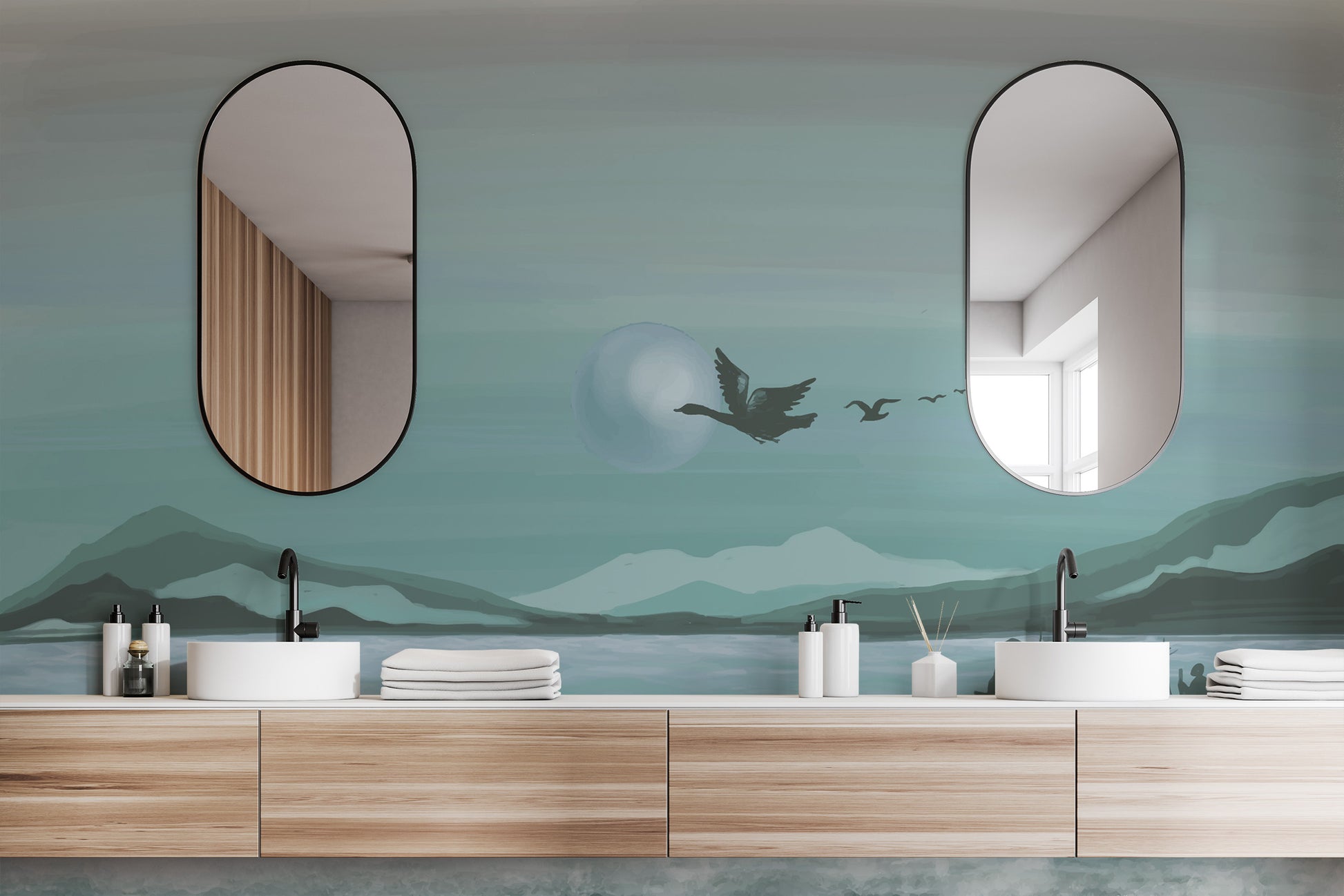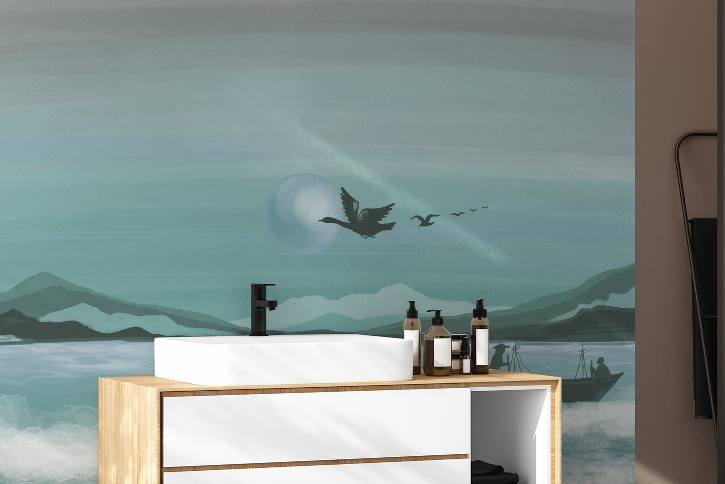 A moonlit sky reflects over gentle ocean waves, creating a serene ocean wallpaper that captures nature's peaceful essence. Birds glide gracefully, adding movement to the flying bird's wallpaper, while a small fishing boat drifts across the calm waters. The distant misty mountains enhance the tranquil seascape wall mural, bringing depth and a soft, dreamy effect. Gentle hues of blue and green blend harmoniously, making the dreamy coastal wallpaper a perfect choice for relaxation. The soothing ocean waves mural brings peace, ideal for those who appreciate minimalist landscapes and nature-inspired aesthetics.