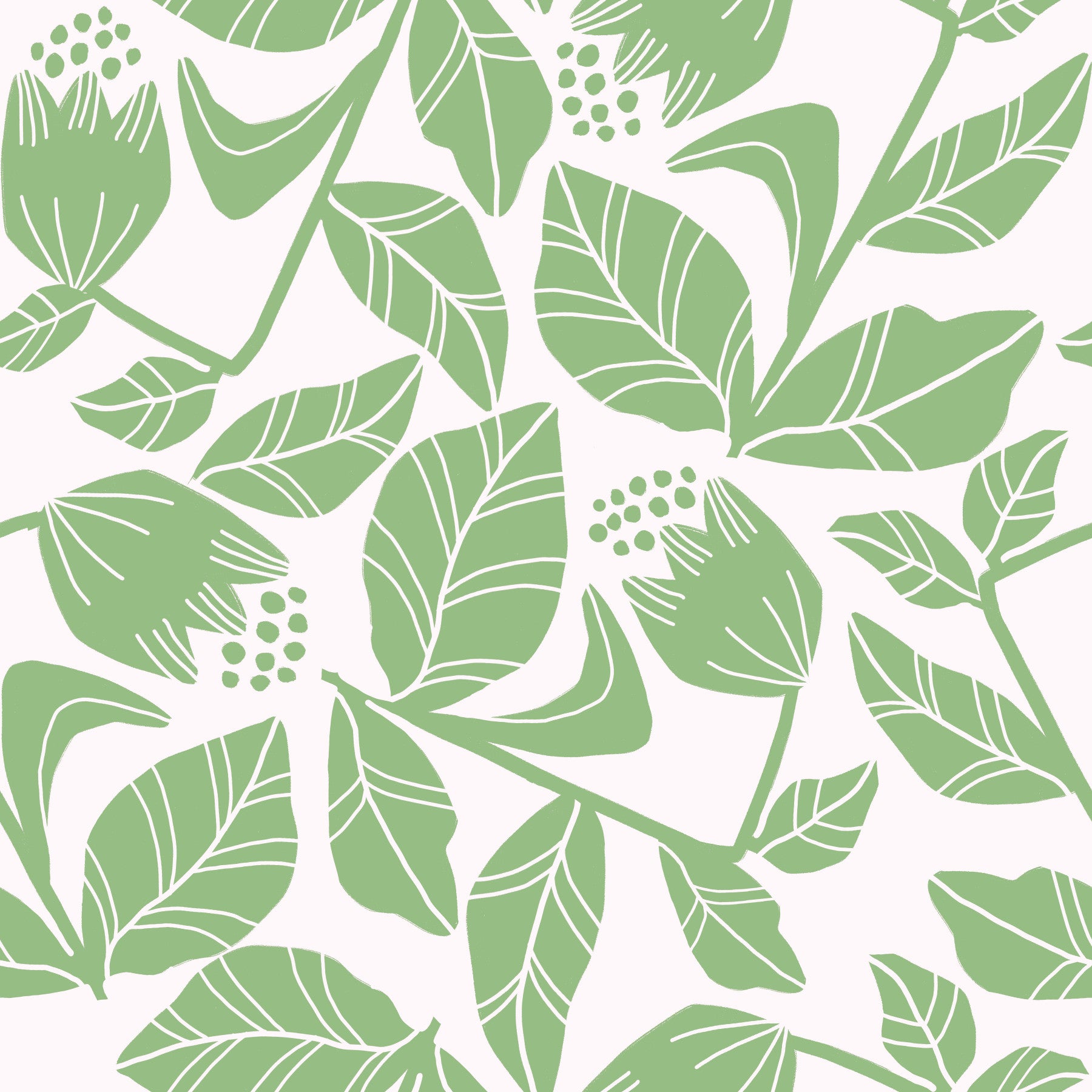 Elevate your space with this whimsical floral design, featuring stylized green flowers and leaves on a white backdrop. The unique shapes and confident lines create a playful, yet sophisticated look. Use this wallpaper for walls in your bedroom, kitchen, or bathroom to create a relaxing retreat. The fresh mint green color is perfect for brightening up any room. Let this fun botanical wallpaper bring a cheerful vibe to your home.