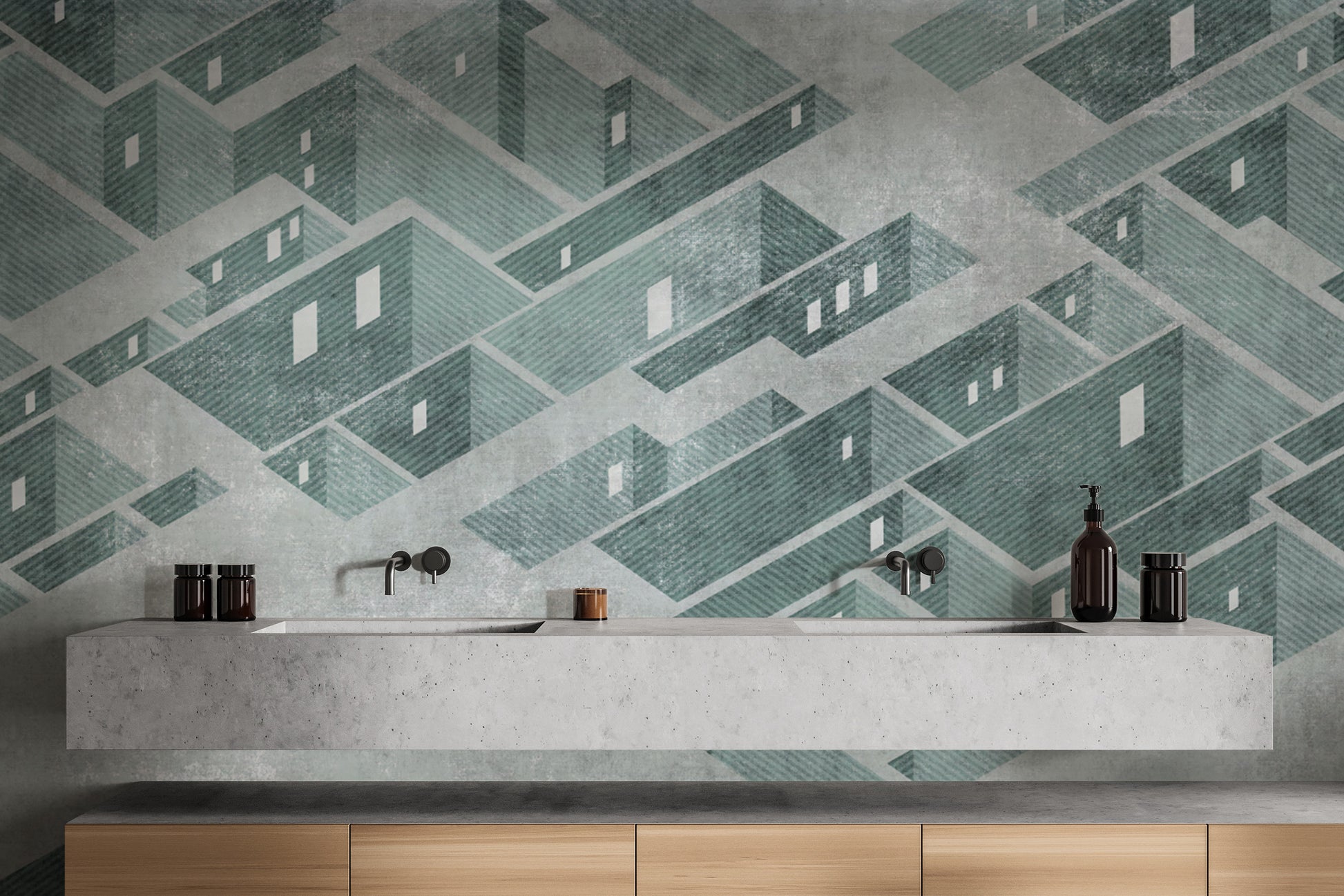 3D isometric mint green abstract building wall mural