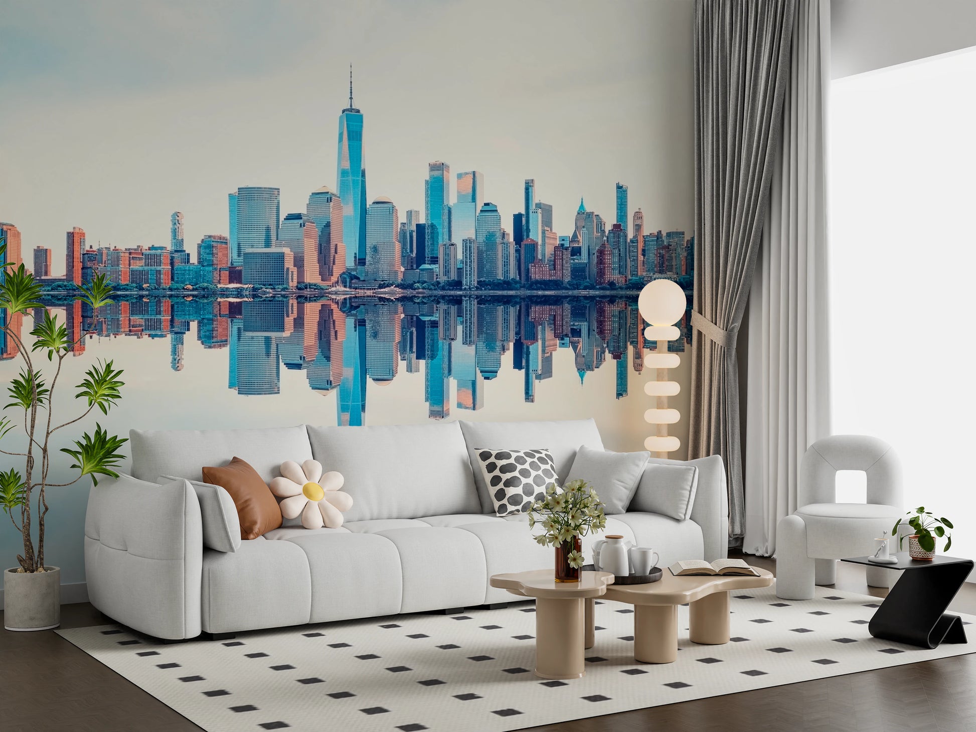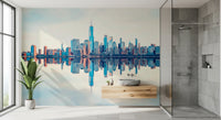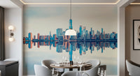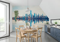 Elevate your interior with this mirrored metropolis wallpaper for walls. The design features a vibrant city skyline with a symmetrical reflection, creating a visually stunning effect. The colour palette balances cool blues with warm oranges and beige tones, which introduces both calmness and energy. It's perfect for adding a contemporary edge to bedrooms, hallways, or living rooms. The clarity of the buildings and the mirrored effect enhances natural light, and it produces a spacious feel. The urban scenery complements modern, minimalist décor, or acts as a bold contrast in more rustic spaces.