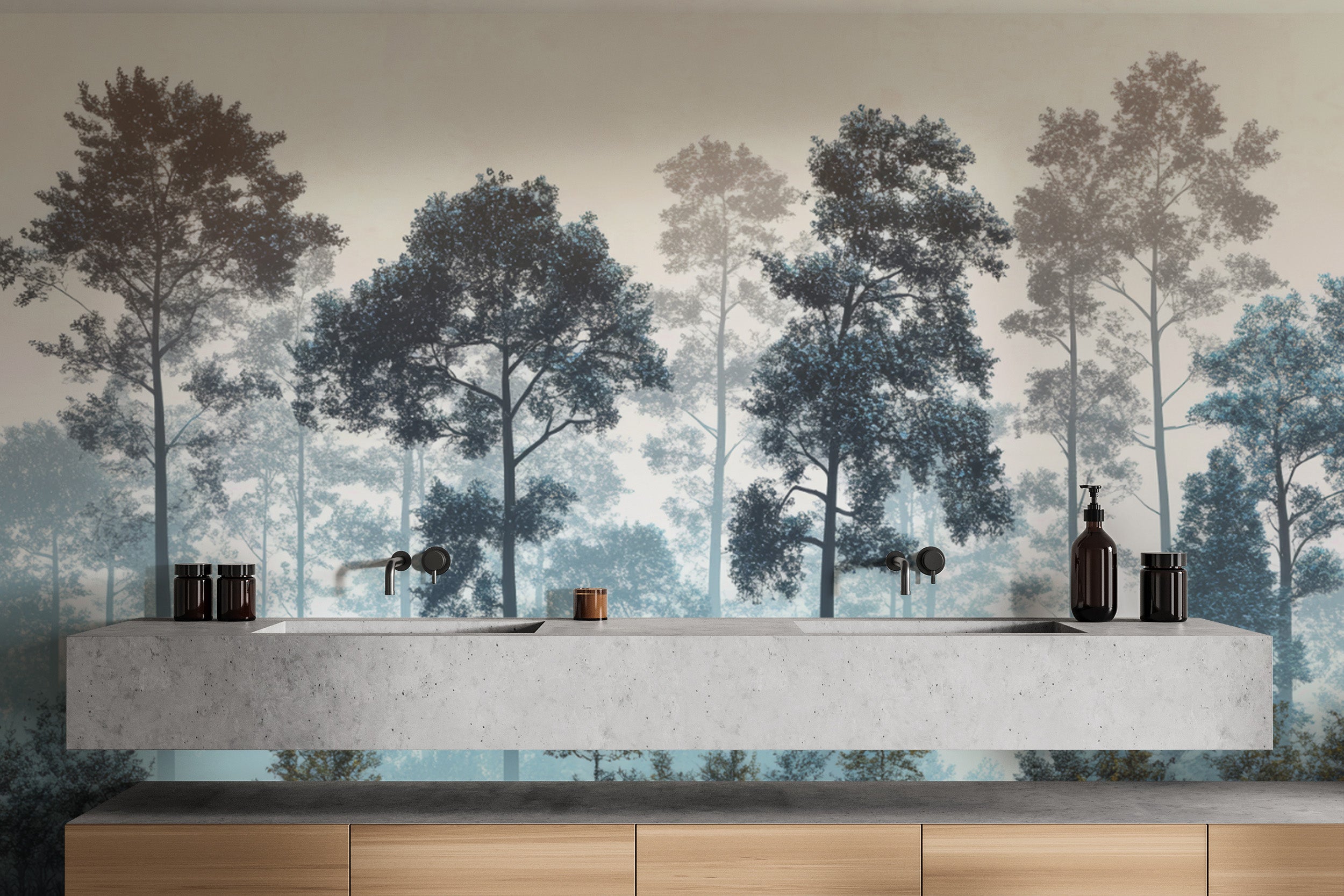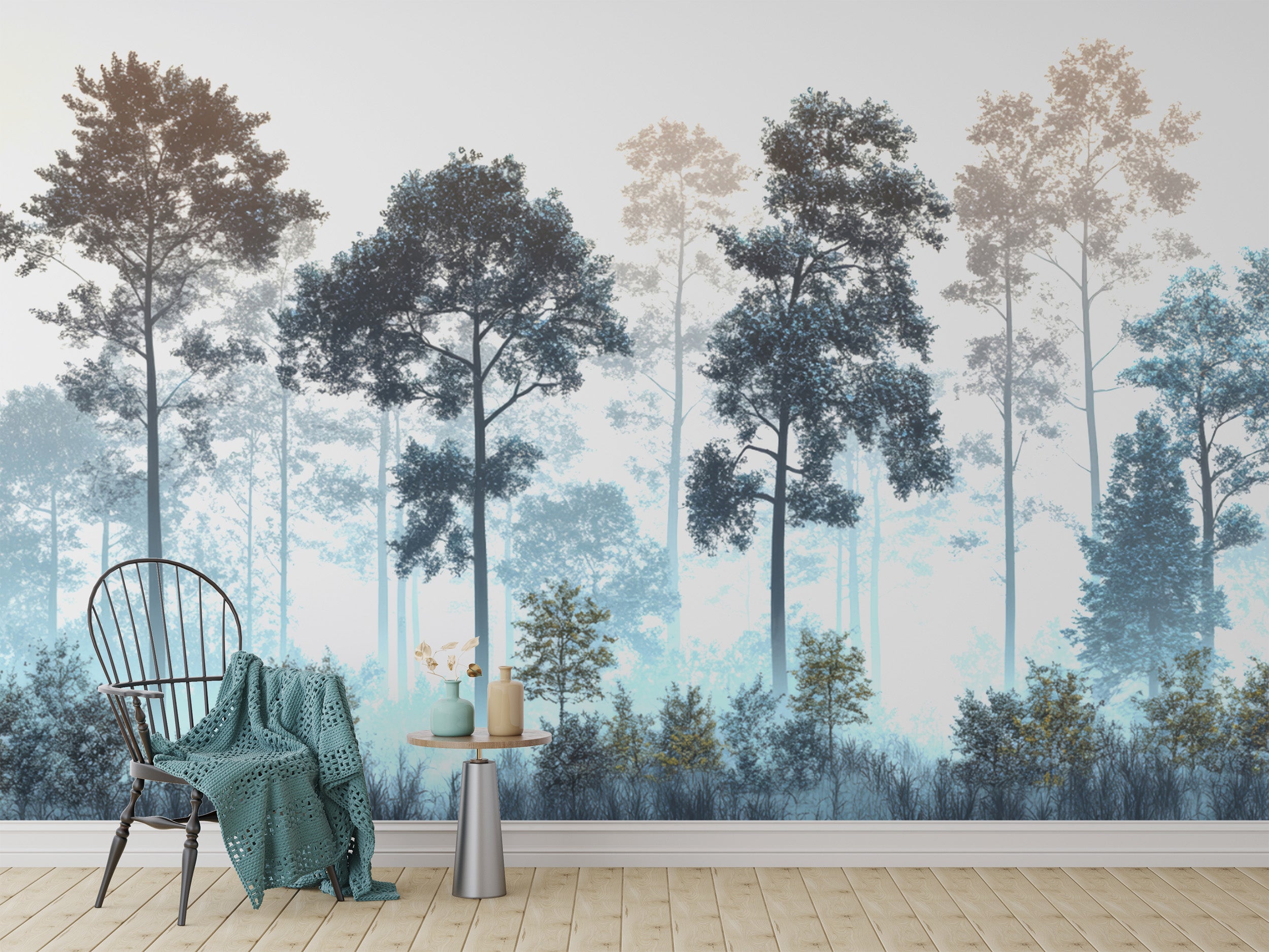 Create a peaceful atmosphere with the misty blue forest mural. Soft blue and gray tones blend with a foggy tree landscape, adding depth and serenity. This design enhances bedrooms, living rooms, and offices with a calming outdoor feel. The detailed tree patterns bring nature indoors, offering a refreshing escape. High-quality materials ensure durability and a smooth finish. The foggy forest wallpaper suits modern and classic interiors alike. Enjoy the beauty of the serene woodland wallpaper, bringing a soothing natural touch to any setting. Choose this scenic nature wallpaper for a timeless and relaxing backdrop.