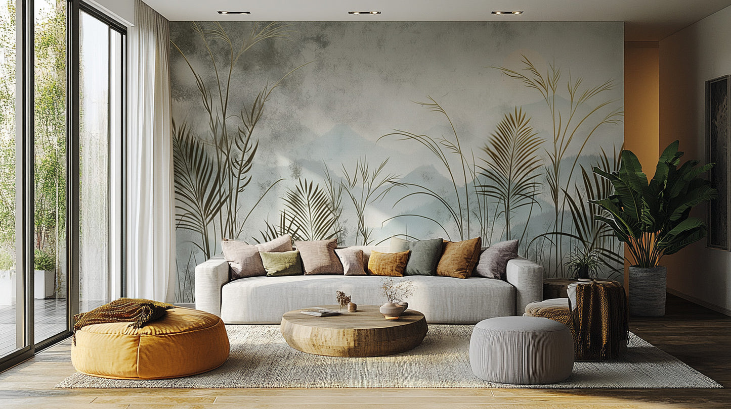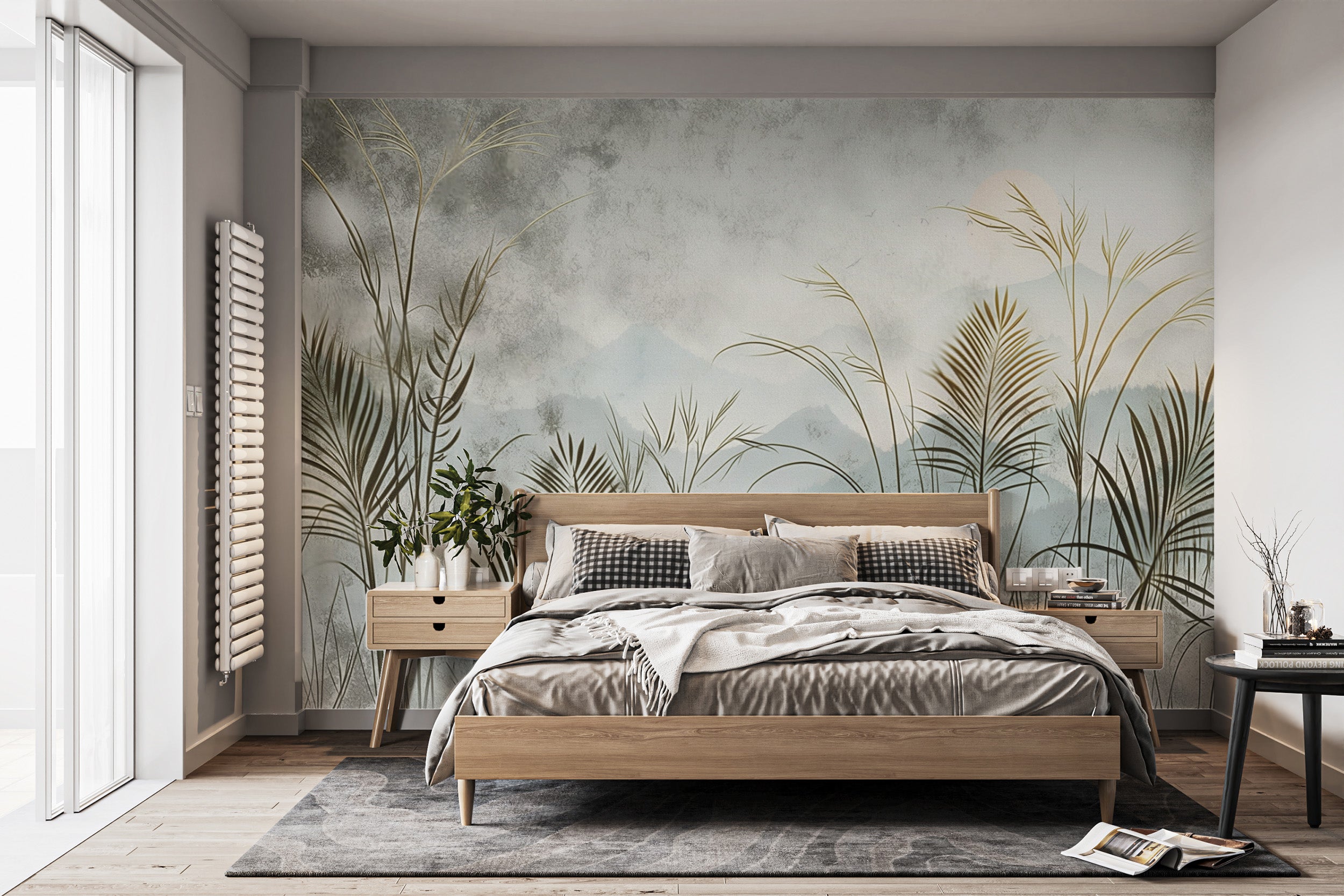 Create a soothing atmosphere with the misty botanical landscape wall mural, featuring delicate palm leaves and a soft mountain backdrop. The blend of earthy tones and misty textures enhances the charm of any setting. Botanical wallpaper mural designs like this bring a sense of nature indoors, making walls a focal point. Nature-inspired wall art elements and subtle gradients add depth to the space. Misty Forest wallpaper styles work well in bedrooms, living rooms, or offices. Crafted for a seamless look, this tropical leaf mural offers a refined aesthetic. Refresh interiors effortlessly with this scenic mountain wallpaper masterpiece.
