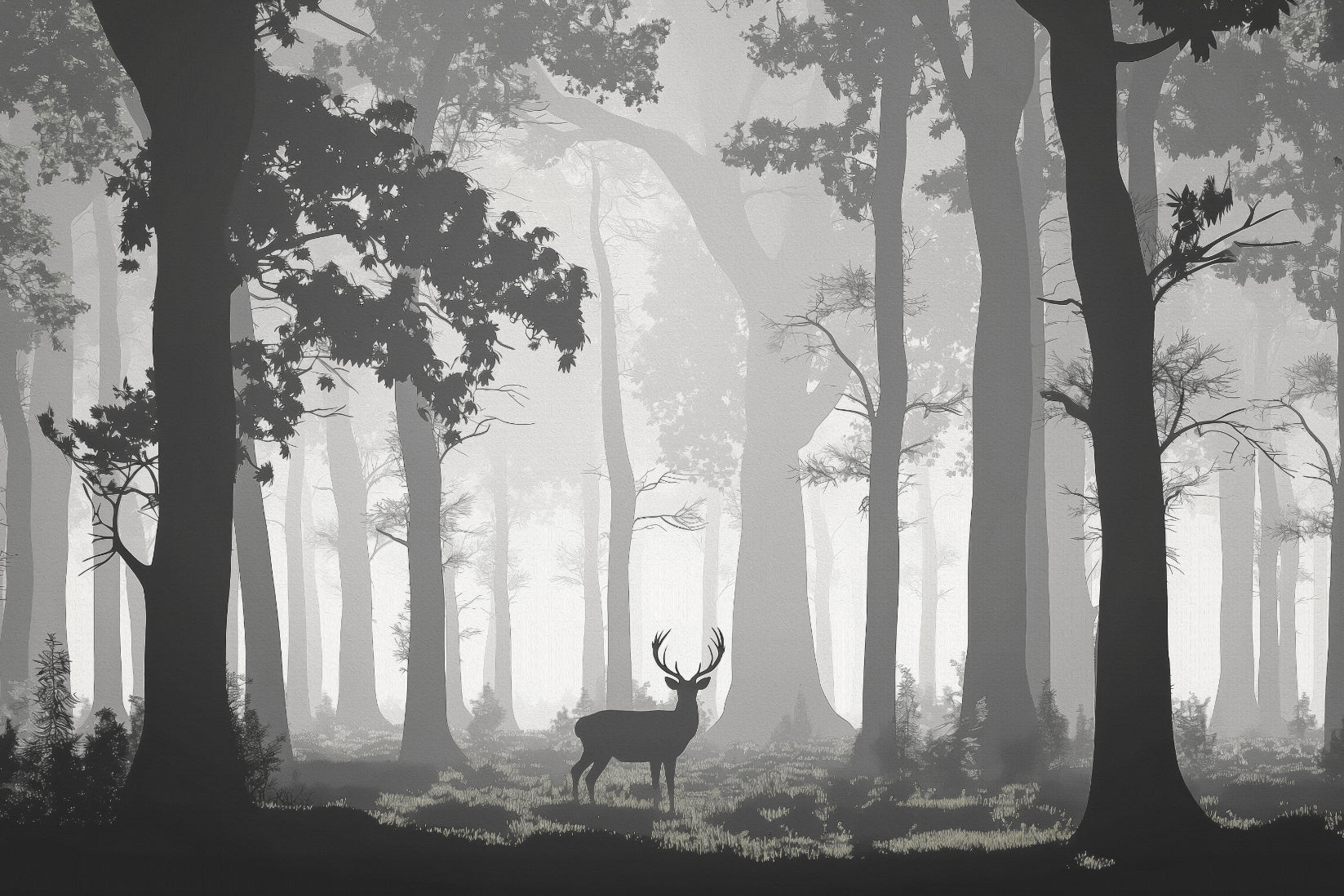 Create a serene atmosphere with the misty deer forest wallpaper mural. This black and white nature wallpaper captures the beauty of a foggy woodland, featuring a majestic deer standing amidst towering trees. The silhouette deer forest art adds depth and elegance to any setting, perfect for bedrooms, living rooms, and offices. The monochrome tree wallpaper blends effortlessly with modern and rustic interiors. Designed with high-quality materials, this peaceful woodland scene wallpaper enhances walls with a calming presence. Bring the beauty of nature indoors with this misty woods aesthetic wallpaper, adding sophistication and charm to any space.