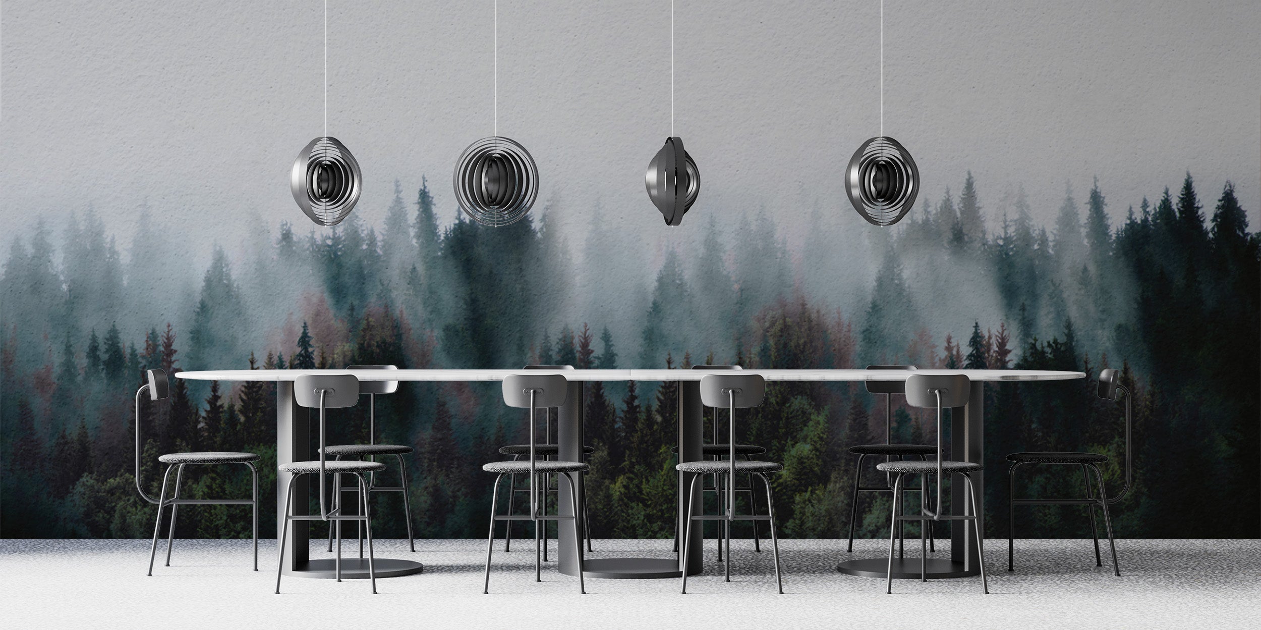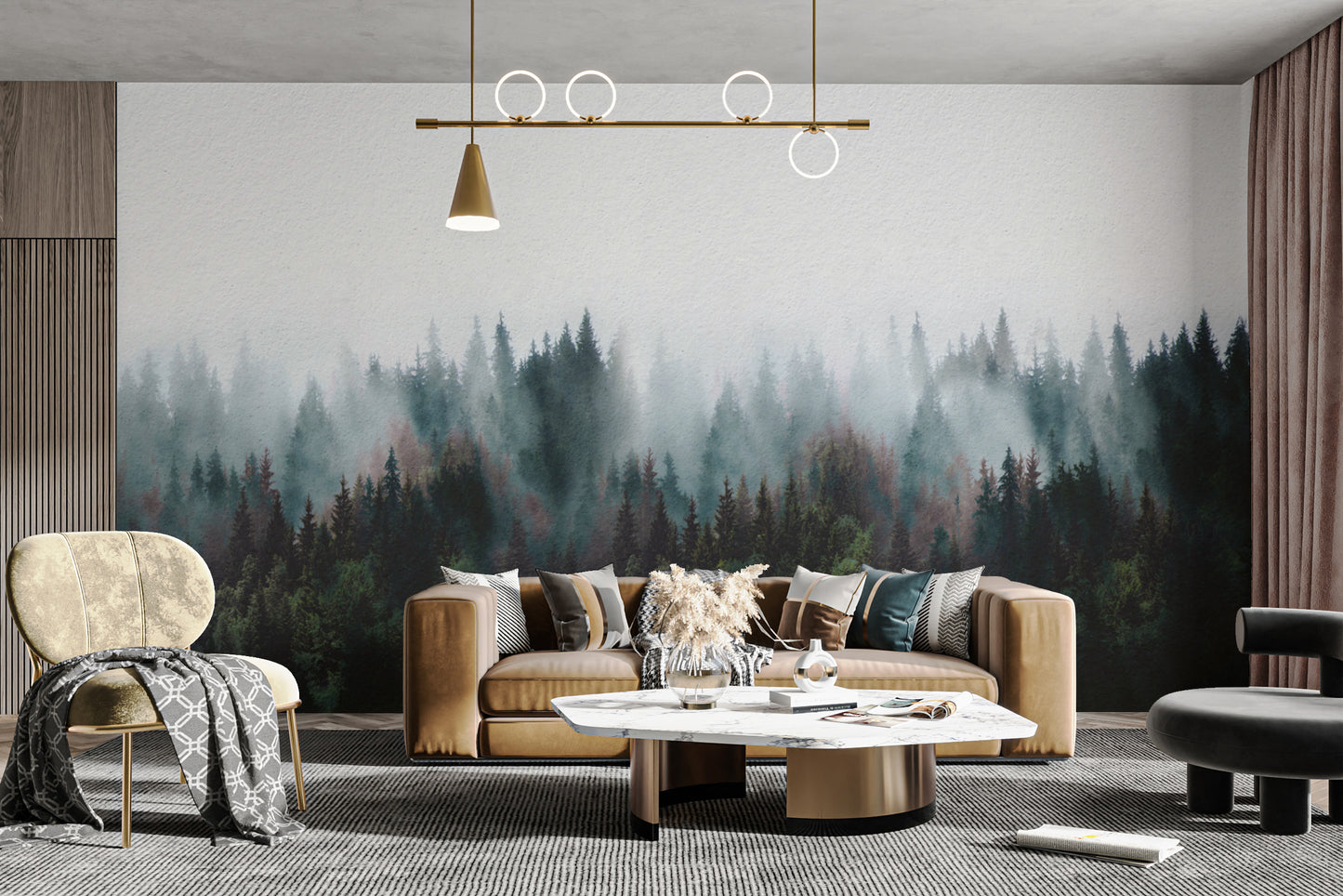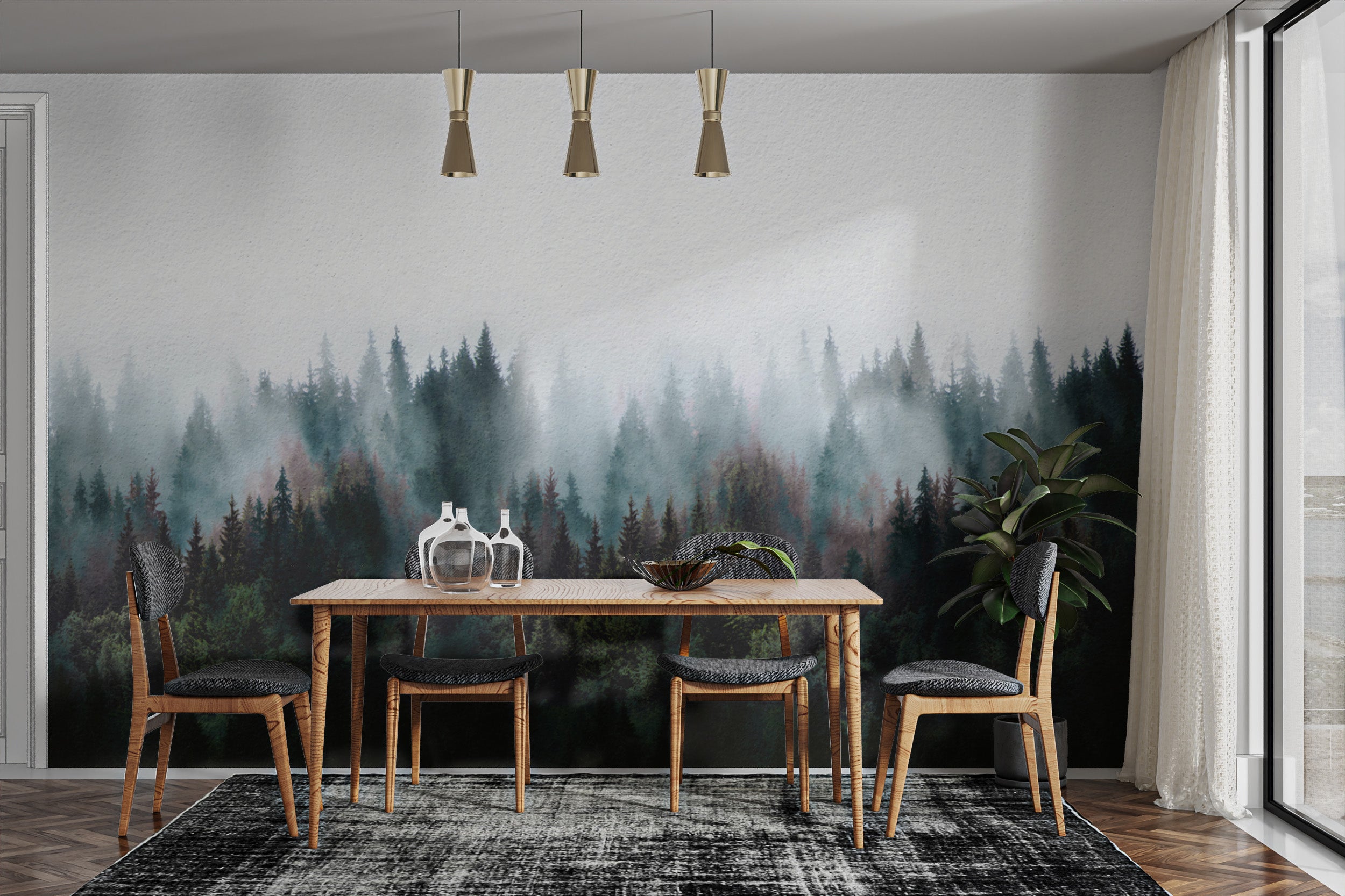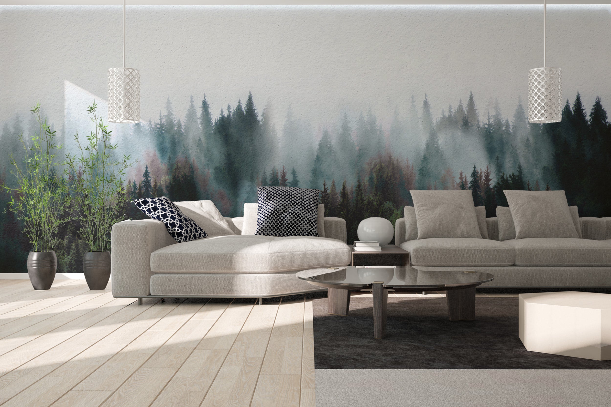 Peaceful misty tree mural for modern interiors