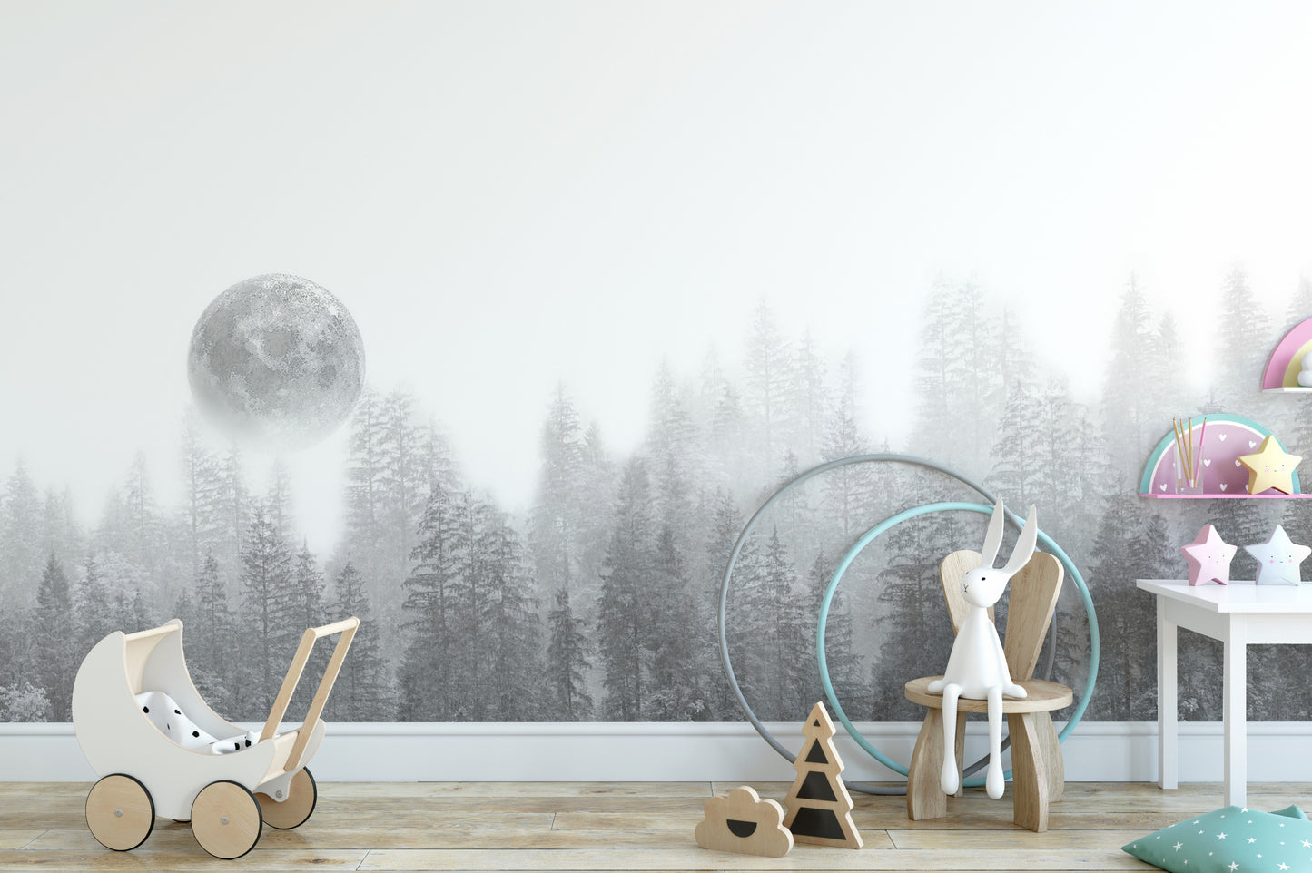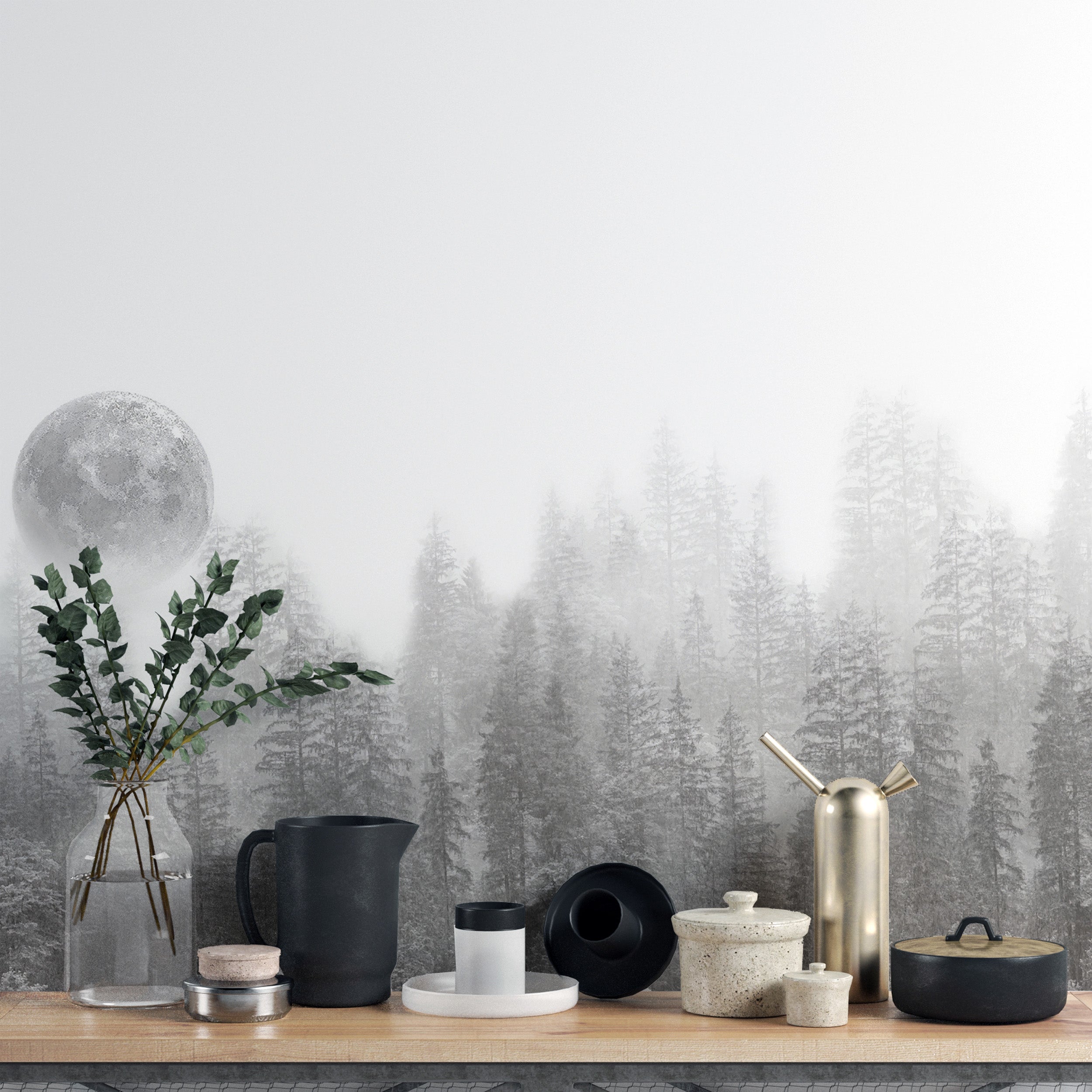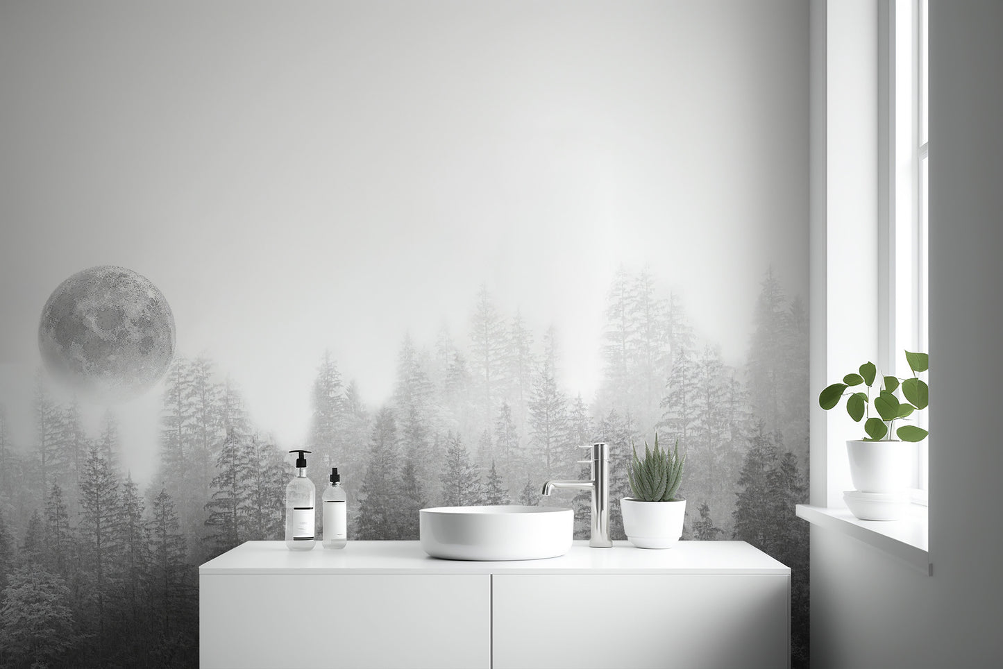 Create a serene atmosphere with the misty forest moon wallpaper mural. This design features towering evergreens fading into a soft mist and a detailed full moon rising through the trees. The monochrome moon and tree wallpaper uses a grayscale palette, adding depth and texture to any room while maintaining a minimalist aesthetic. Perfect for bedrooms, living rooms, or offices, this mystical forest landscape wallpaper brings nature indoors with a calm, ethereal touch. The foggy forest wall covering suits modern and nature-inspired interiors, offering a unique visual statement that blends effortlessly with various styles.