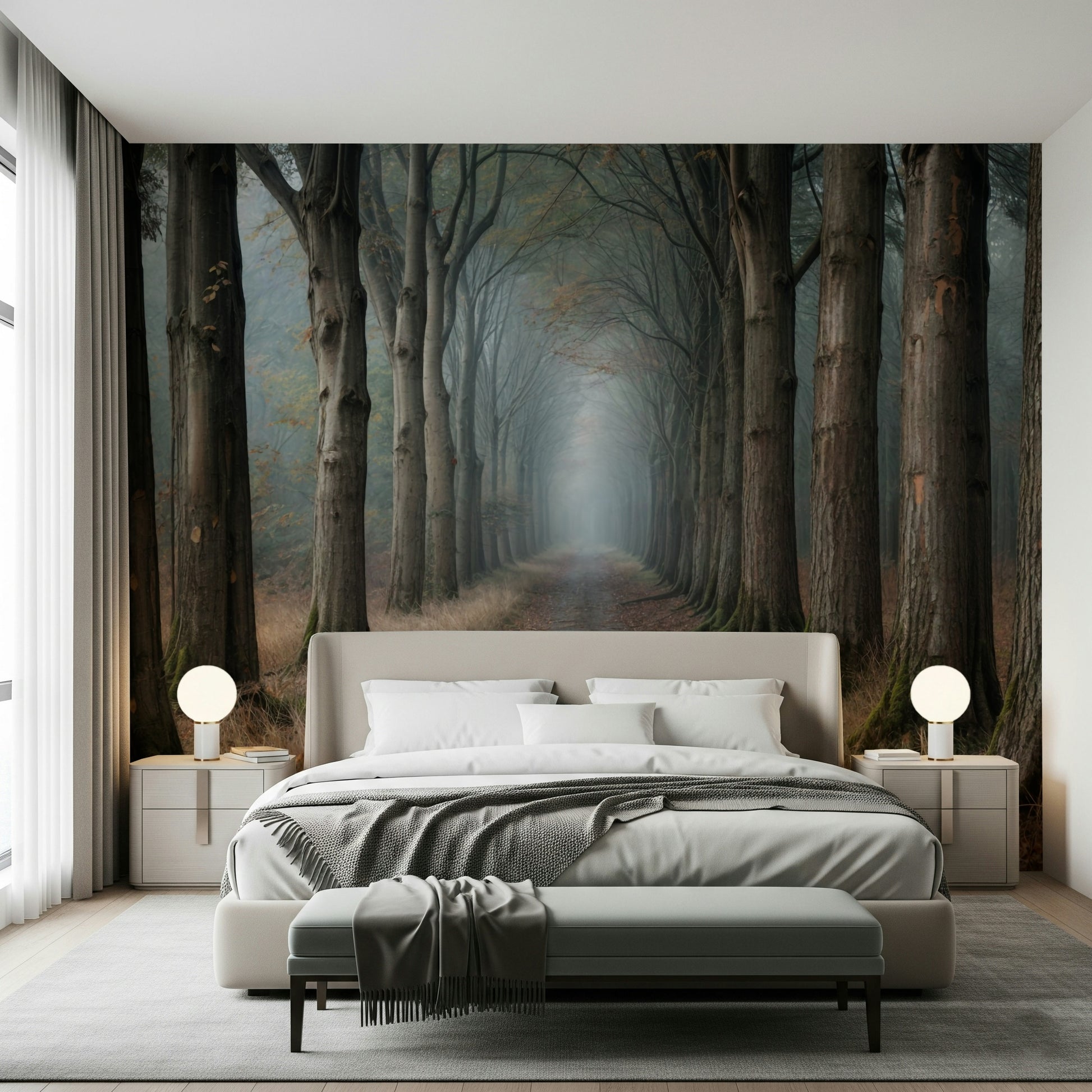 Transform your space with this captivating wallpaper for walls, depicting a serene forest path shrouded in mist. The tall, stately trees create a sense of depth and tranquility, drawing the eye toward an ethereal vanishing point. A palette of muted browns, greys, and subtle greens evokes a sense of calm and sophistication. Ideal for living rooms, bedrooms, or hallways, this design infuses your interior with a touch of nature's mystery. Its quiet elegance will complement both modern and rustic décor styles, enriching the atmosphere of any room.