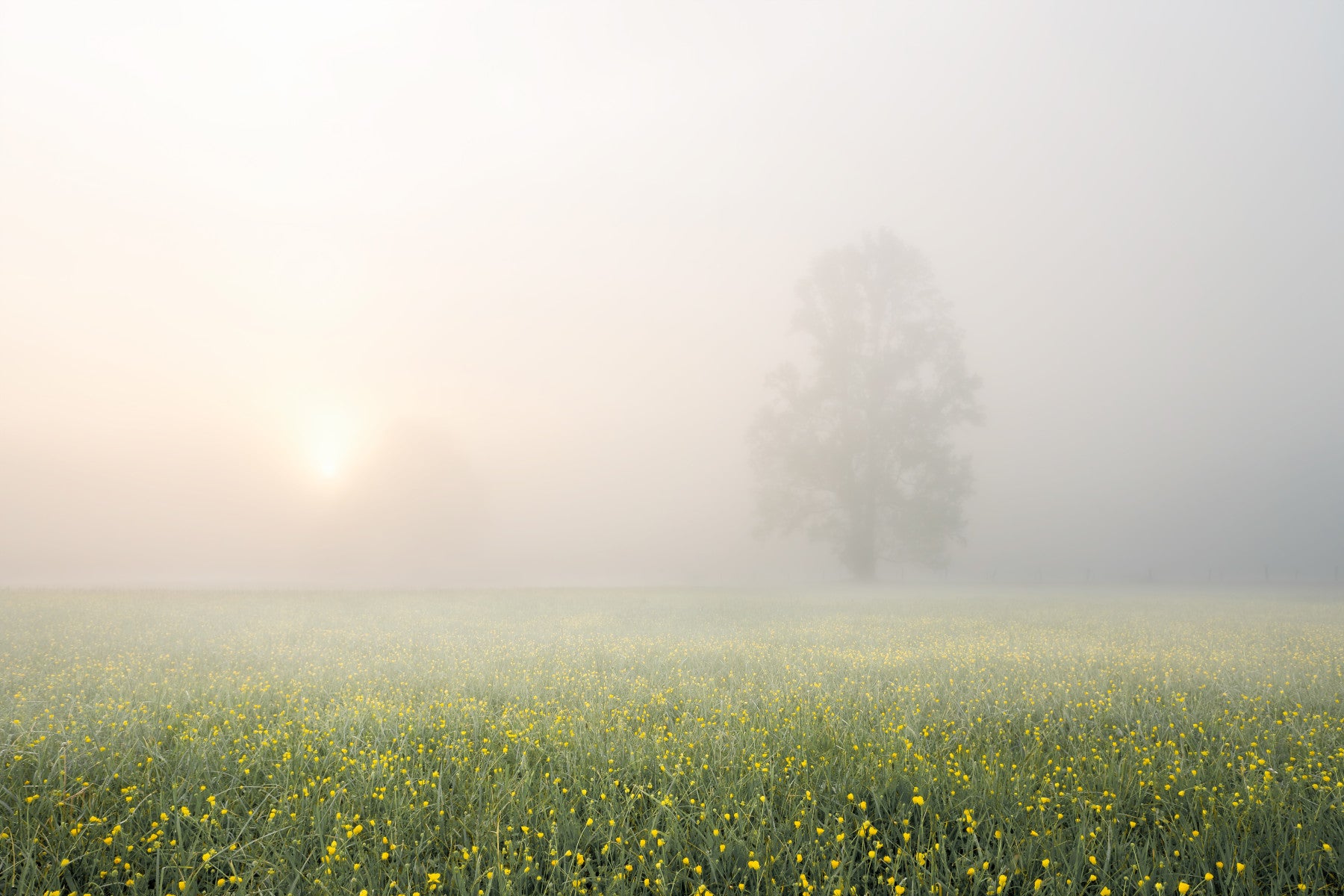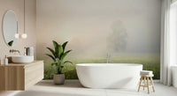 Invite nature's tranquil charm into your home. This serene wallpaper for walls captures a meadow bathed in soft mist, where countless yellow flowers bloom. A lone tree emerges from the fog, adding depth to the peaceful scene. The gentle colours and dreamlike quality open up spaces, making it ideal for bedrooms, living rooms, or any area where calm is desired. It creates a soothing, relaxing atmosphere, perfect for interiors seeking understated beauty.