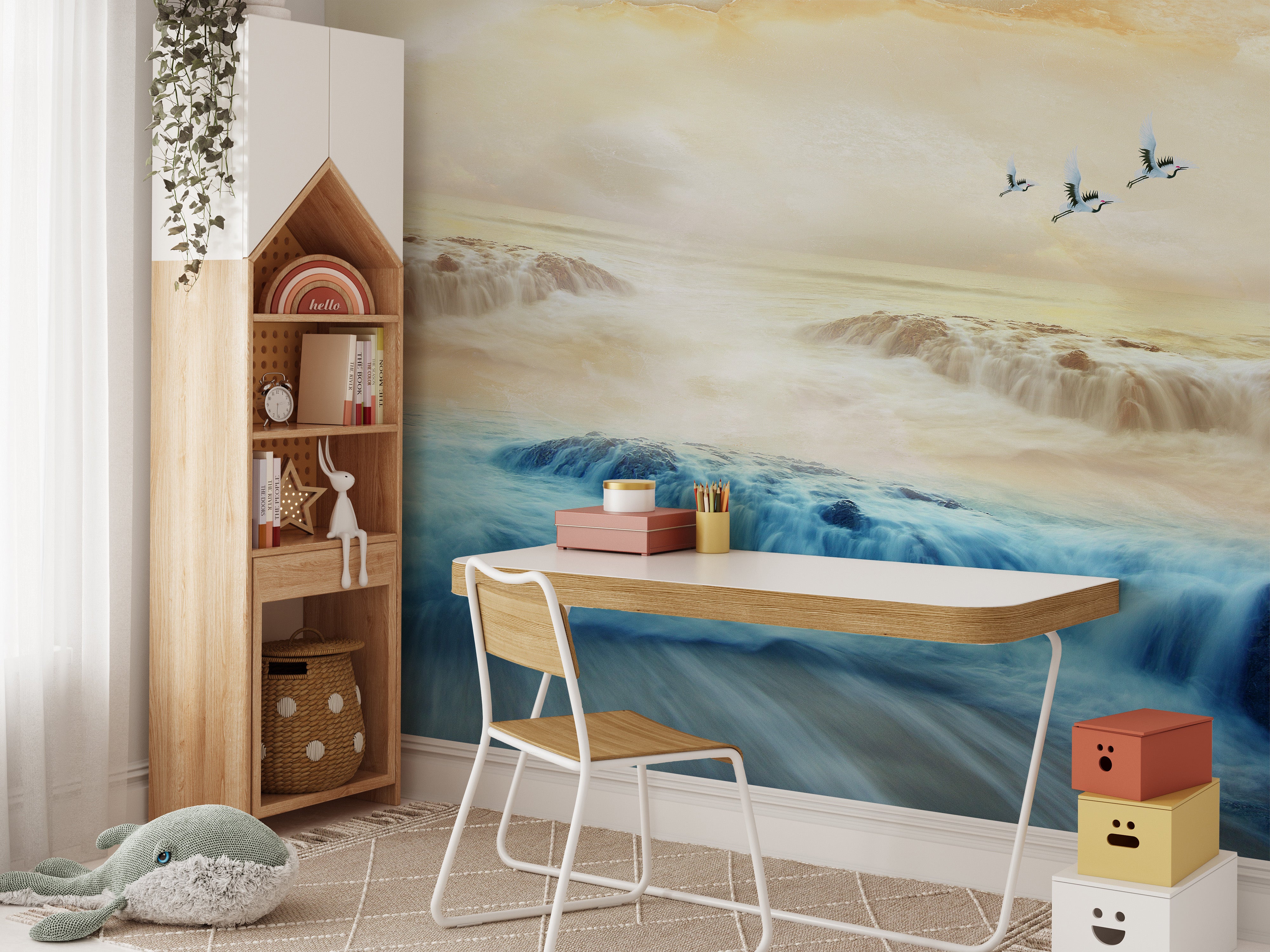Artistic peel-and-stick mural featuring cranes and misty landscapes.