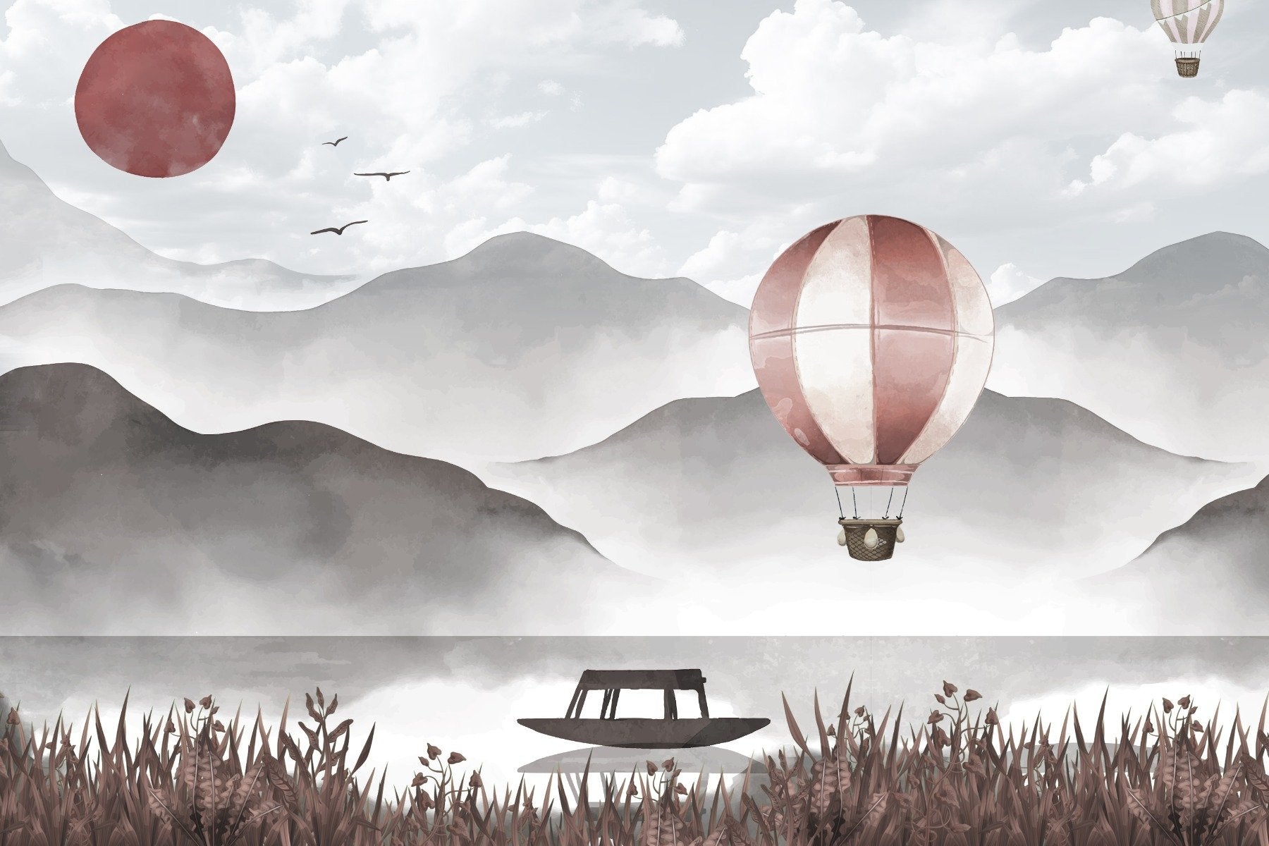 Embark on a visual ascent with the misty peaks hot air balloon mural, where the gentle caress of the crimson sun meets the stoic grace of mountain silhouettes. This mural is not just a decoration. It's a journey aloft, captured in the hues of a red balloons wallpaper that whispers of dawn's first light. It's where the dreams of flight and the majesty of mountain wallpaper converge, offering a breath of elevation to any room. Glide through the clouds with each gaze, and let your walls narrate the silent epic of a voyage among the peaks. This piece is a quiet ode to the lofty spirits who seek the sky's embrace, with each hot air balloon a vessel to the heavens.