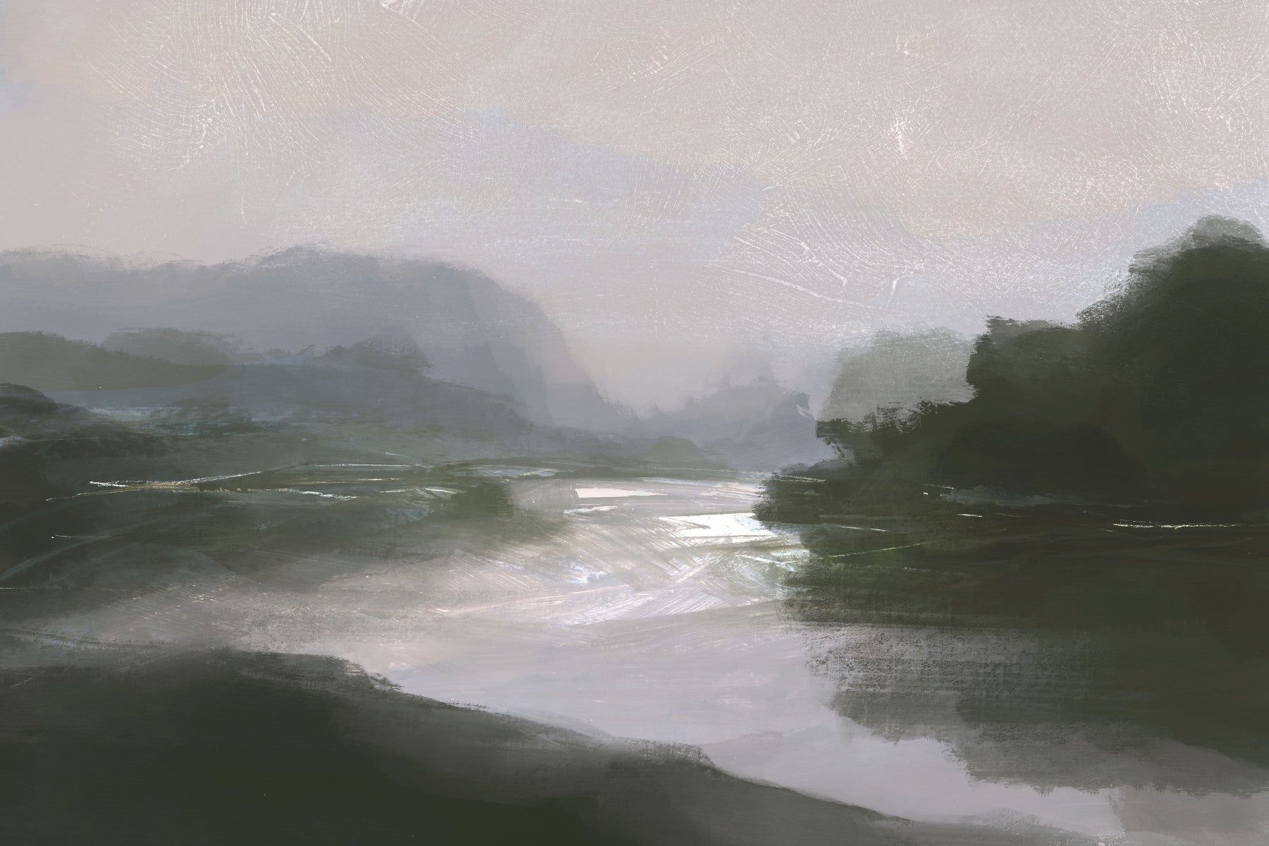 A beautiful wide-angle wall mural of a hazy river.