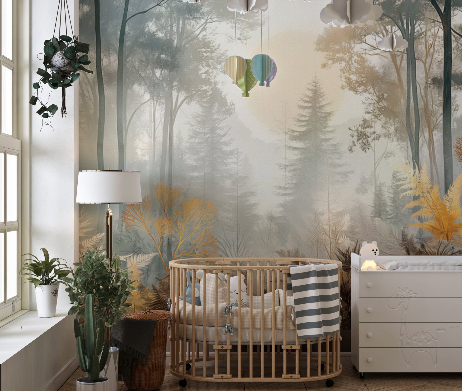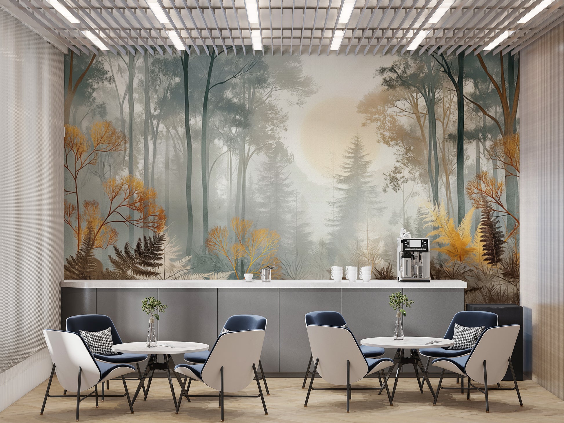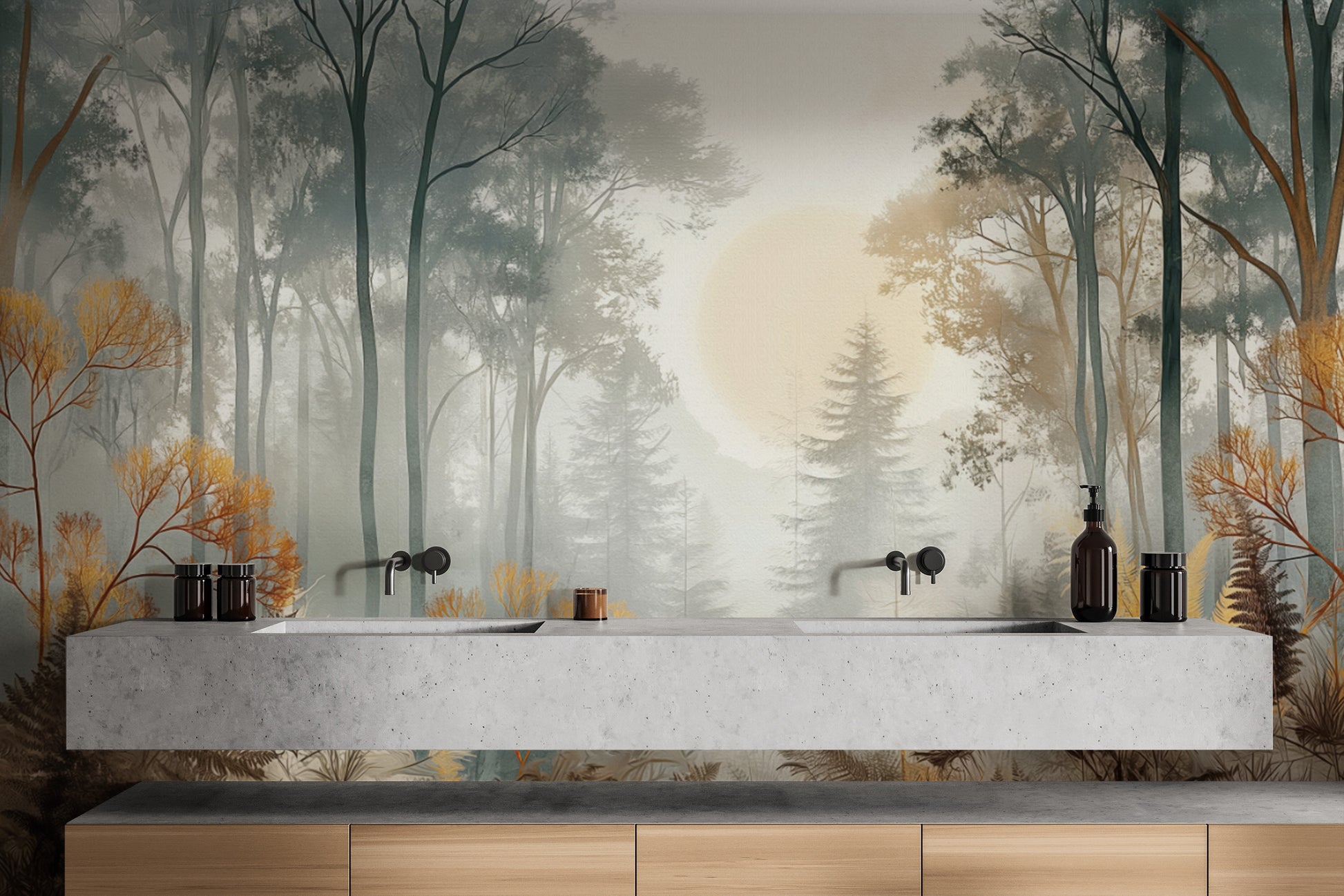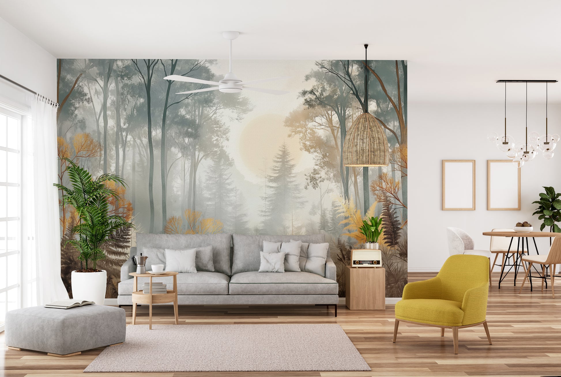 Misty sunlit forest wallpaper mural brings nature's beauty indoors with a serene woodland scene. Soft sunlight filters through towering trees, casting a golden glow over lush foliage. The foggy woodland design creates a peaceful atmosphere, perfect for bedrooms, living rooms, or offices. This scenic forest peel-and-stick wallpaper features rich details, enhancing the space with natural elegance. Botanical jungle mural elements blend seamlessly with muted greens and earthy tones. Ideal for nature lovers, this wallpaper adds depth and dimension while complementing various interiors. Experience the calming effect of a sunlit forest with this elegant and timeless landscape wall covering.