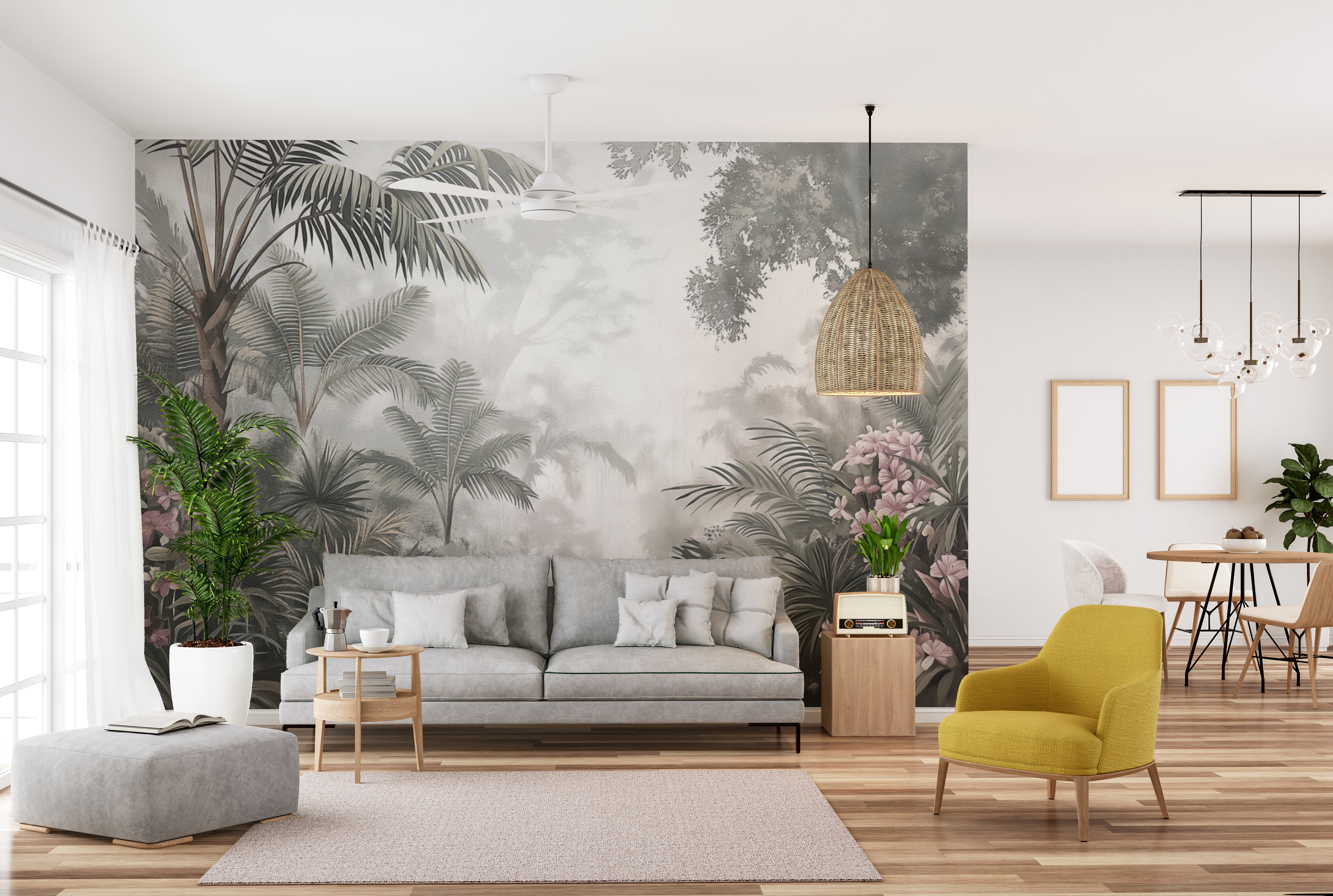 Bring nature indoors with the misty tropical jungle wallpaper mural featuring lush greenery, palm leaves, and blooming flowers. The soft mist creates a serene rainforest setting, adding depth and warmth to any room. This botanical wall wallpaper blends muted tropical tones with elegant details, making it ideal for bedrooms, living rooms, or office spaces. The vintage tropical wall decor enhances interiors with a calming nature-inspired backdrop. Crafted with high-quality materials, this exotic palm tree wallpaper offers durability and a stunning visual appeal. Experience the beauty of a tropical paradise wallpaper design, effortlessly bringing natural elegance to your walls.