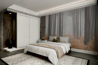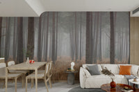 Misty forest with tall trees and foliage. Step into a tranquil woodland with this beautiful wallpaper for walls. The design features tall, slender trees enveloped in a gentle fog, creating a sense of peace and mystery. The colour palette focuses on muted browns and subtle greys, offering a versatile backdrop for various rooms. Use this design to create a soothing bedroom, a relaxing living area, or an inviting hallway. The forest scene brings a touch of nature indoors. This forest complements many interiors.