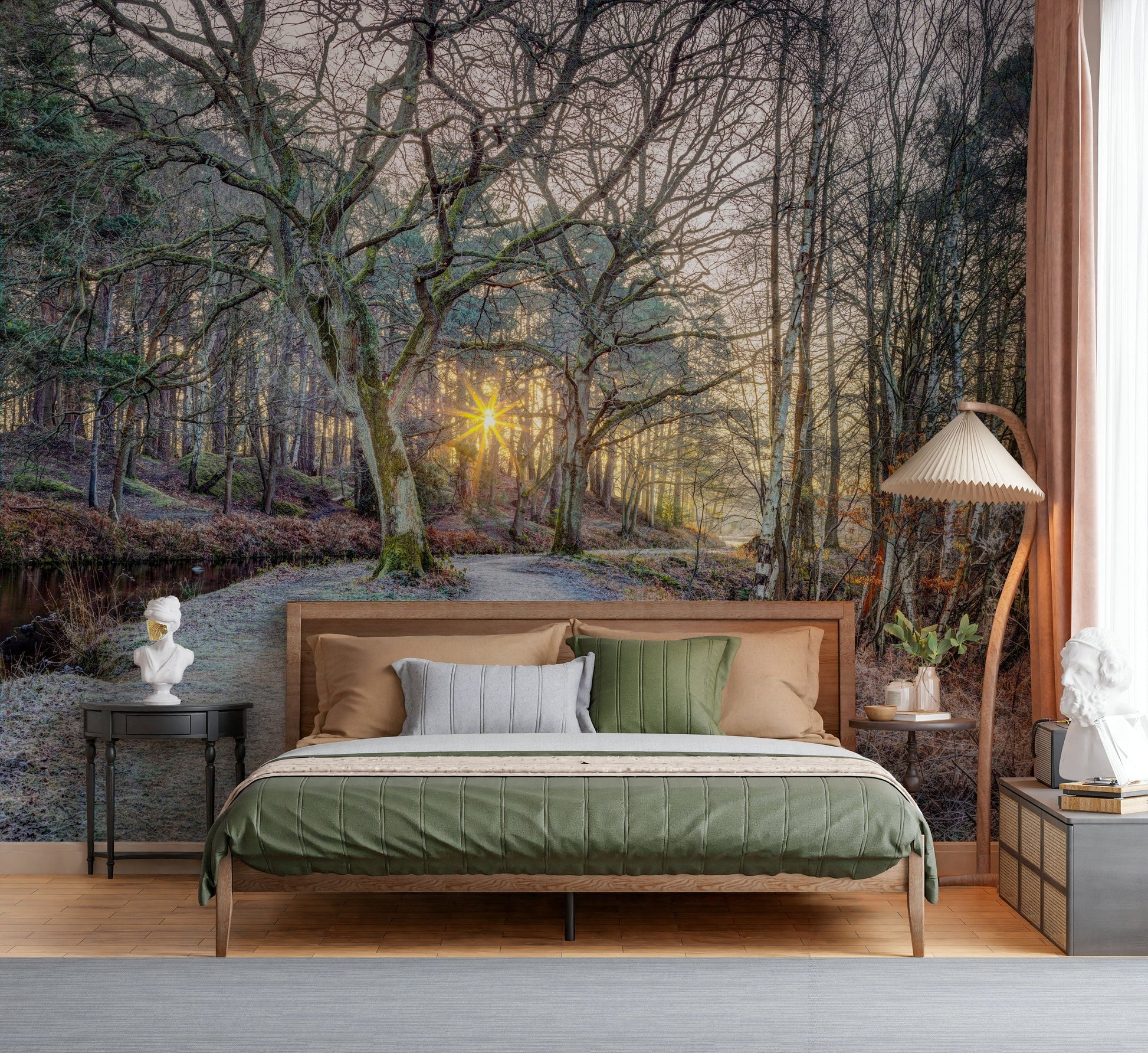 Canal in countryside with trees and pathway. Transform your space with 'Misty Woodland Glare', a captivating wall covering that evokes the serene beauty of a forest awakening. Imagine stepping into a world where the soft embrace of mist intertwines with the ethereal glow of dawn, casting a mesmerising glare through the skeletal branches of ancient trees. This artwork captures that precise moment of tranquil illumination, perfect for bringing a sense of peace and natural wonder to any room. The scene portrays a path, lightly kissed by frost, leading deeper into the woods, inviting contemplation and exploration. The delicate balance of light and shadow, the crisp air suggested by the frost, and the intricate detail of the bare trees create an immersive experience, adding depth and texture to your walls and transforming your living space into a calming woodland retreat.