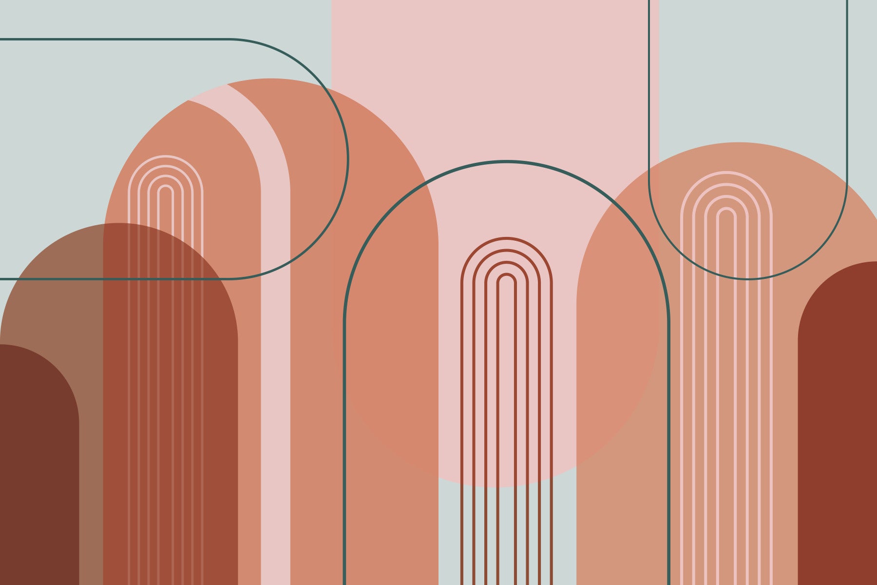 This modern wallpaper design features a captivating arrangement of abstract arches and lines in a palette of warm, earthy tones. The combination of terracotta, dusty rose, and muted greens creates a sophisticated and calming atmosphere. The clean lines and geometric shapes offer a contemporary feel, suitable for various spaces seeking a touch of understated elegance. The minimalist aesthetic makes it adaptable to different interior design styles, adding a quiet sophistication to bedrooms, living rooms, or home offices.