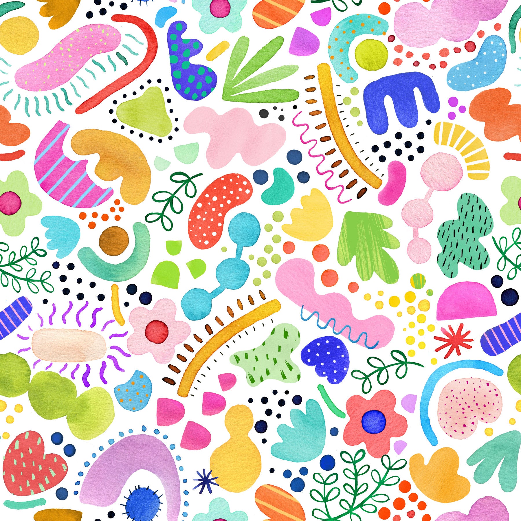 This vibrant wallpaper bursts with energy, showcasing a playful collision of bold, abstract shapes and organic forms. A delightful mix of hand-painted watercolor textures in a spectrum of joyful colors—from sunny yellows and oranges to cool blues and greens—creates a dynamic and uplifting mood. The design features whimsical flowers, abstract leaves, and intriguing organic shapes, all interwoven to create a sense of movement and captivating visual rhythm. It’s a perfect choice for adding a modern, artistic touch to any digital device, infusing your space with cheerful and expressive energy.