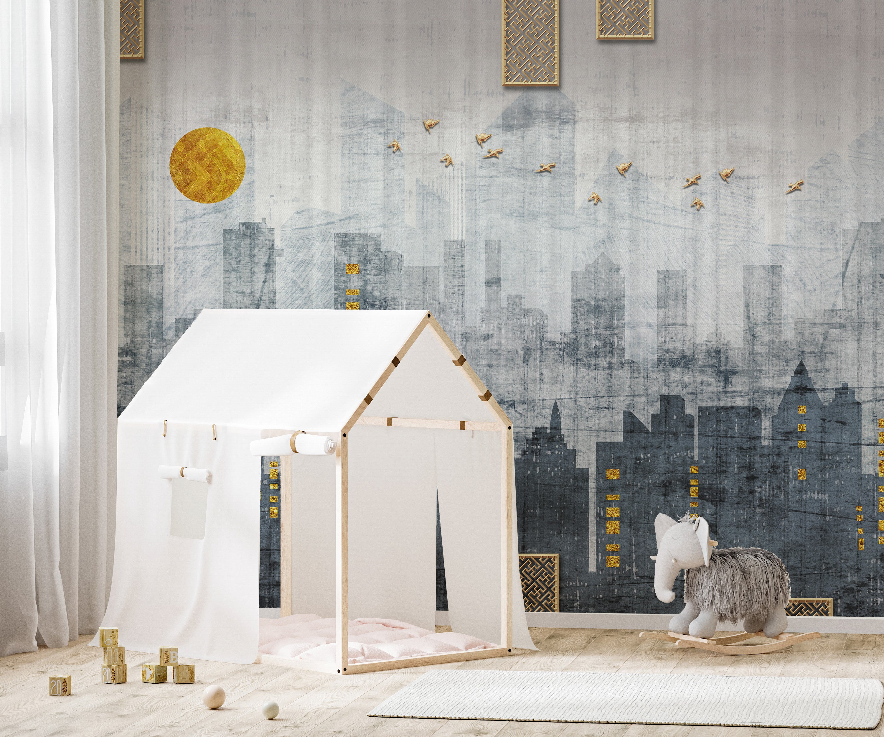 This mural wallpaper features a stunning city silhouette depicted in shades of modern blue. The design captures the essence of a bustling metropolis, with towering skyscrapers and a dynamic skyline. Using varying blue tones creates a contemporary and stylish look, which adds a touch of urban elegance to any room. The blue wallpaper is carefully crafted to showcase detailed architectural elements, making the cityscape realistic and artistically engaging. It is an ideal choice for those who appreciate the beauty of city life and wish to bring a sophisticated, urban feel to their interior decor. The mural’s large scale and vivid colours make it a focal point in any space, providing a visually striking and unique backdrop. Whether used in a living room, office, or bedroom, this city silhouette wallpaper in modern blue will surely enhance the aesthetic appeal of the environment.