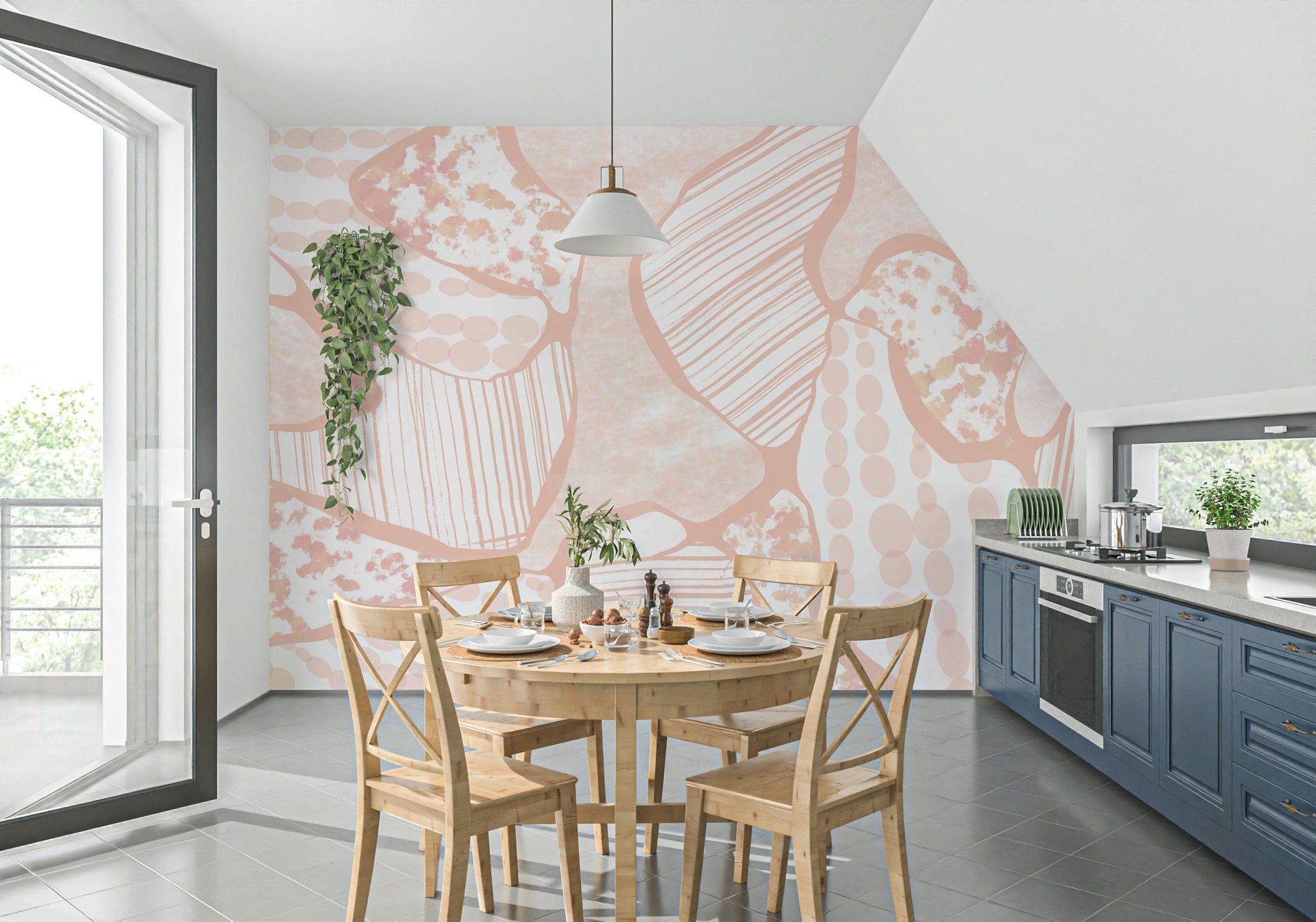 Explore this minimalist design, highlighting peach shapes and patterns. The layout features a combination of solid forms and textured segments with lines and dots that create a unique look. The soft colour palette makes it a good option for spaces where you want a subtle visual. Consider this patterned wallpaper for walls in an office, hallway, or bedroom. The soft tones complement interiors, delivering a sense of peaceful sophistication.