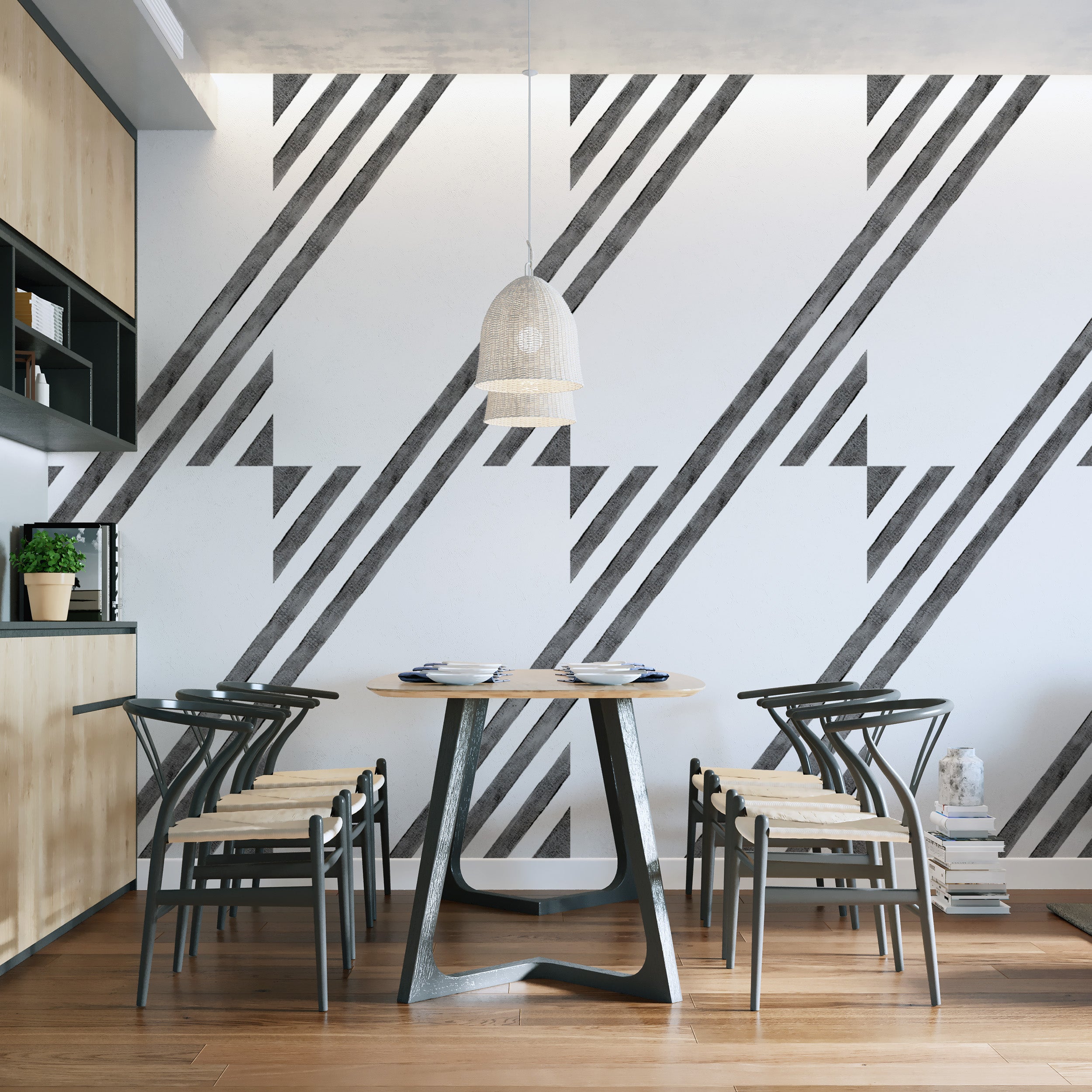 This modern geometric black and white wallpaper adds a bold touch to your walls. The sharp diagonal stripe pattern brings any room a sleek, contemporary look. Its monochrome design pairs well with minimalist and modern interiors, creating a stylish backdrop for living rooms, bedrooms, or offices. The geometric wallpaper's crisp lines and balanced contrast add depth and interest without overwhelming the space. Whether for a feature wall or a full-room makeover, this black and white wallpaper offers a timeless, versatile design that effortlessly complements various furniture styles and color schemes.