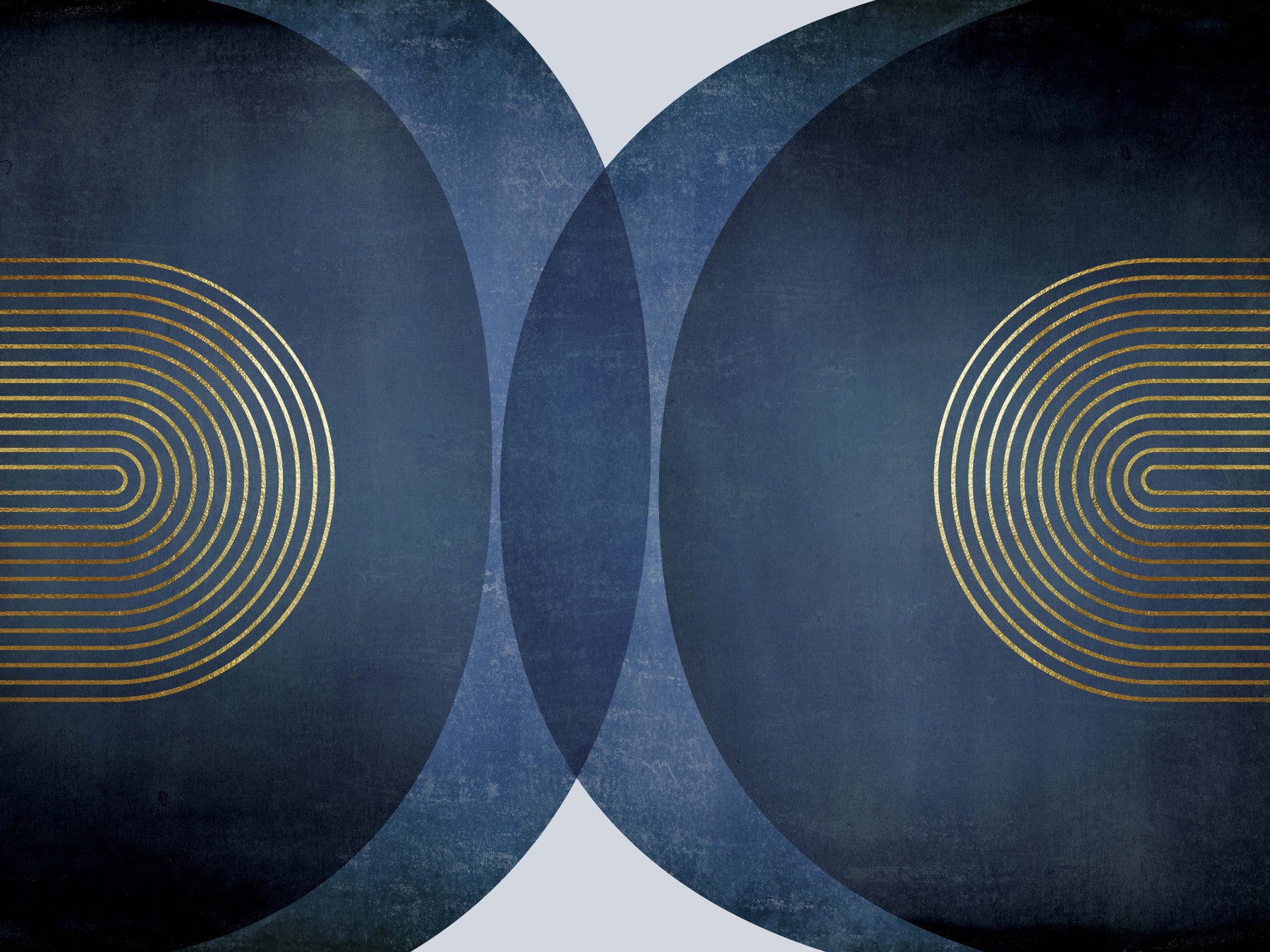 This stunning wallpaper captures the essence of Modern Mid-Century design with its sophisticated blend of deep blue hues and elegant gold accents. Interlocking, textured circles create a sense of depth and movement, while the delicately placed golden arcs add a touch of refined geometric artistry. The slightly distressed, almost vintage-like texture of the background adds a layer of warmth and character, grounding the otherwise clean lines of the design. This wallpaper exudes a sense of calm sophistication, perfect for adding a touch of understated luxury to any modern space. The rich color palette and balanced composition make it a versatile choice for living rooms, bedrooms, or home offices, instantly elevating the aesthetic.