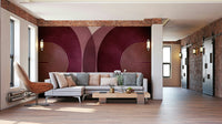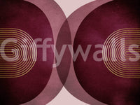 Indulge in the sophisticated elegance of this Modern Mid Century Burgundy wallpaper. Rich burgundy hues, reminiscent of a luxurious wine, form the backdrop for subtly textured, overlapping circles. Delicate gold metallic lines, arranged in elegant concentric arches, add a touch of refined glamour, echoing the geometric patterns of mid-century modern design. This wallpaper exudes a sense of calm sophistication, perfect for adding a touch of vintage-inspired luxury to any contemporary space. The interplay of deep burgundy and muted rose tones, contrasted with the shimmering gold, creates a visually stunning and harmonious design that is both modern and timeless.