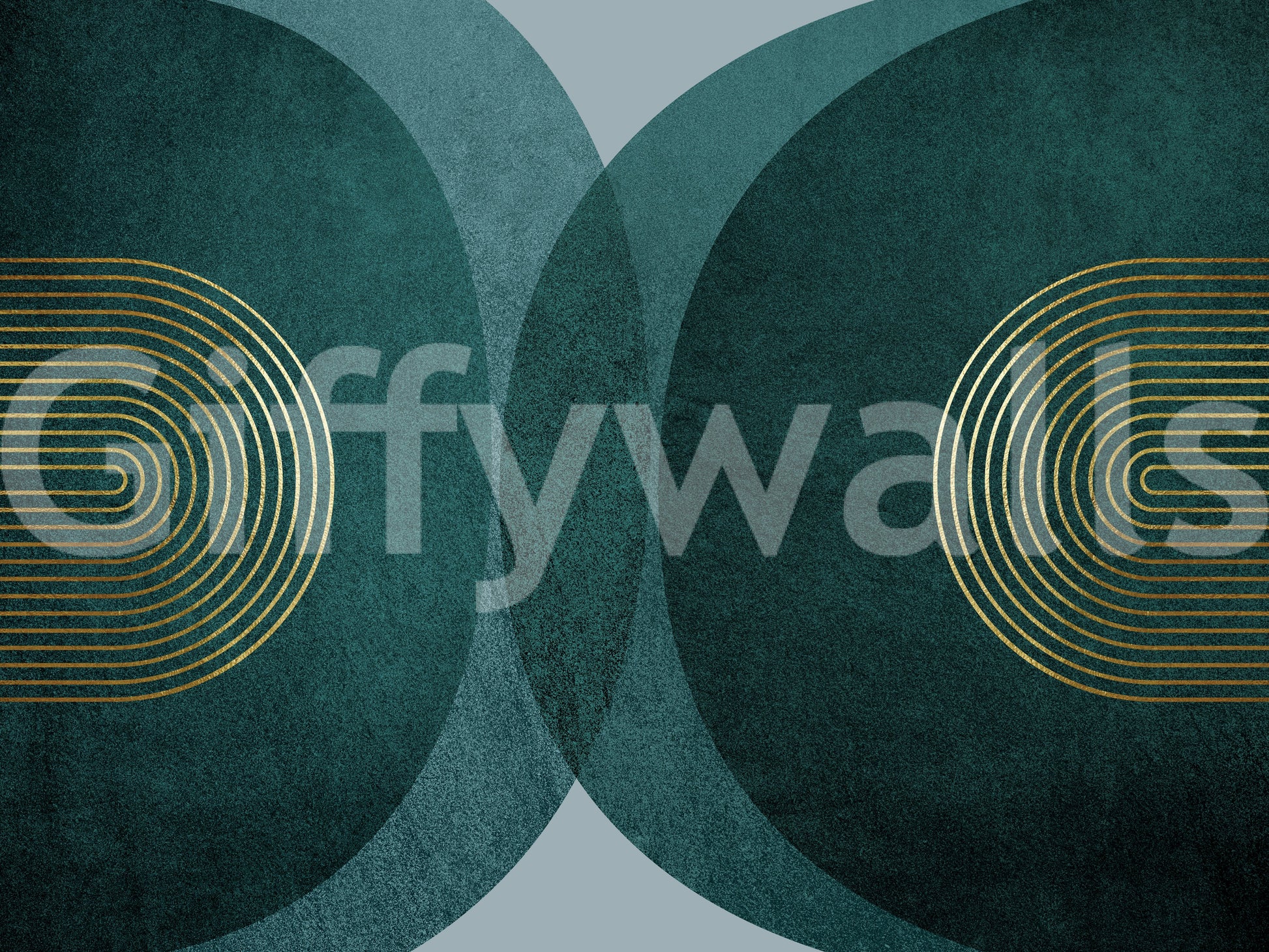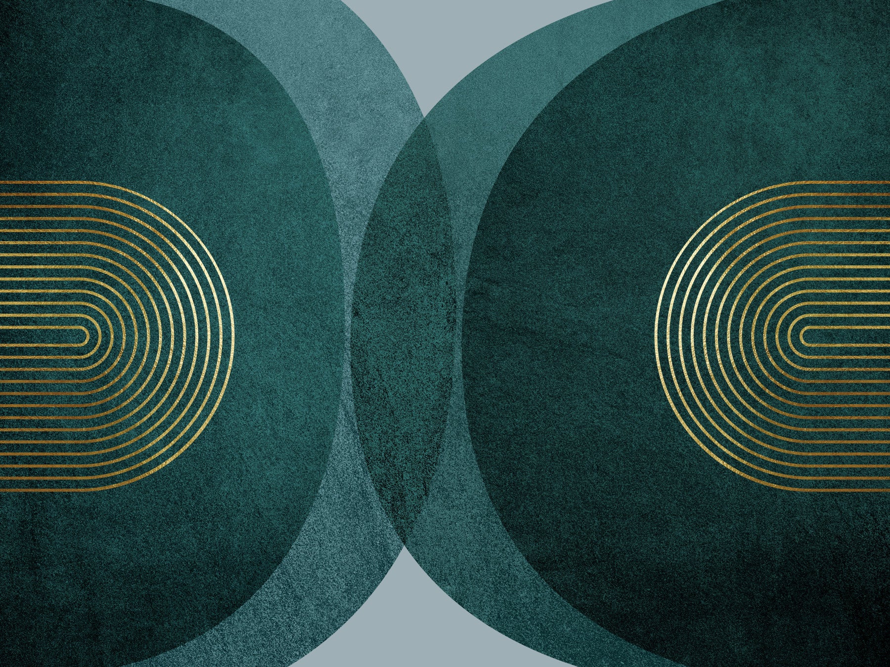 Embrace sophisticated serenity with this "Modern Mid Century in Teal" wallpaper. Deep teal textured circles, reminiscent of mid-century modern design, intersect against a soft grey backdrop. Elegant gold lines, arranged in graceful arcs, add a touch of luxury and geometric precision. The subtle interplay of textures and the rich color palette creates a calming yet stylish atmosphere, perfect for adding a touch of retro-chic to any room.