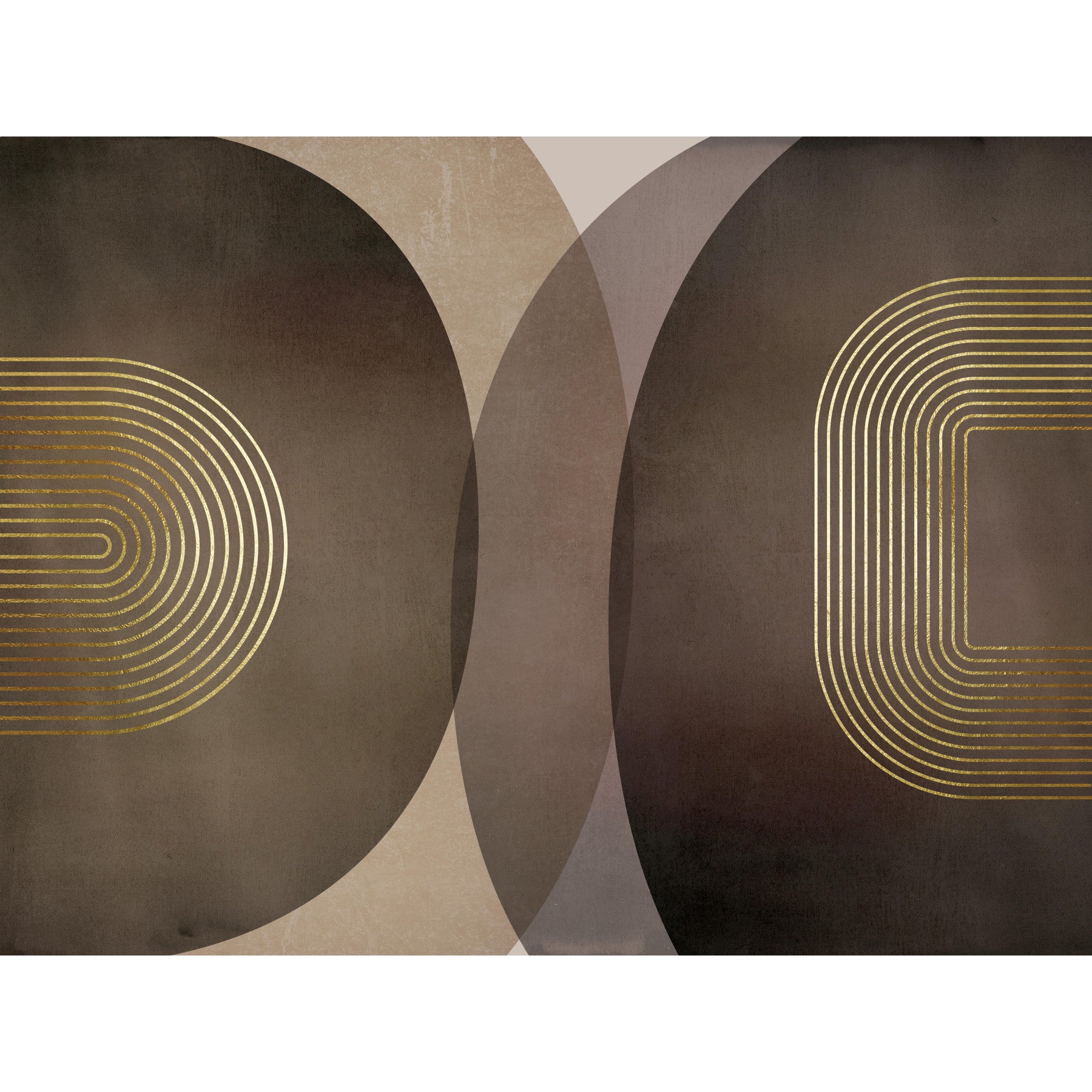 This wallpaper embodies the essence of Modern Mid Century Rustic with its sophisticated blend of earthy tones and geometric grace. Subtle textured backgrounds in muted browns and beige create a sense of calm rusticity, while the striking gold-toned, concentric arched lines introduce a modern, almost minimalist aesthetic. The overlapping semi-circles suggest a sense of depth and movement, perfectly balancing the organic and geometric elements for a tranquil yet visually engaging design. This piece is perfect for adding a touch of understated elegance to any modern or rustic-inspired space.