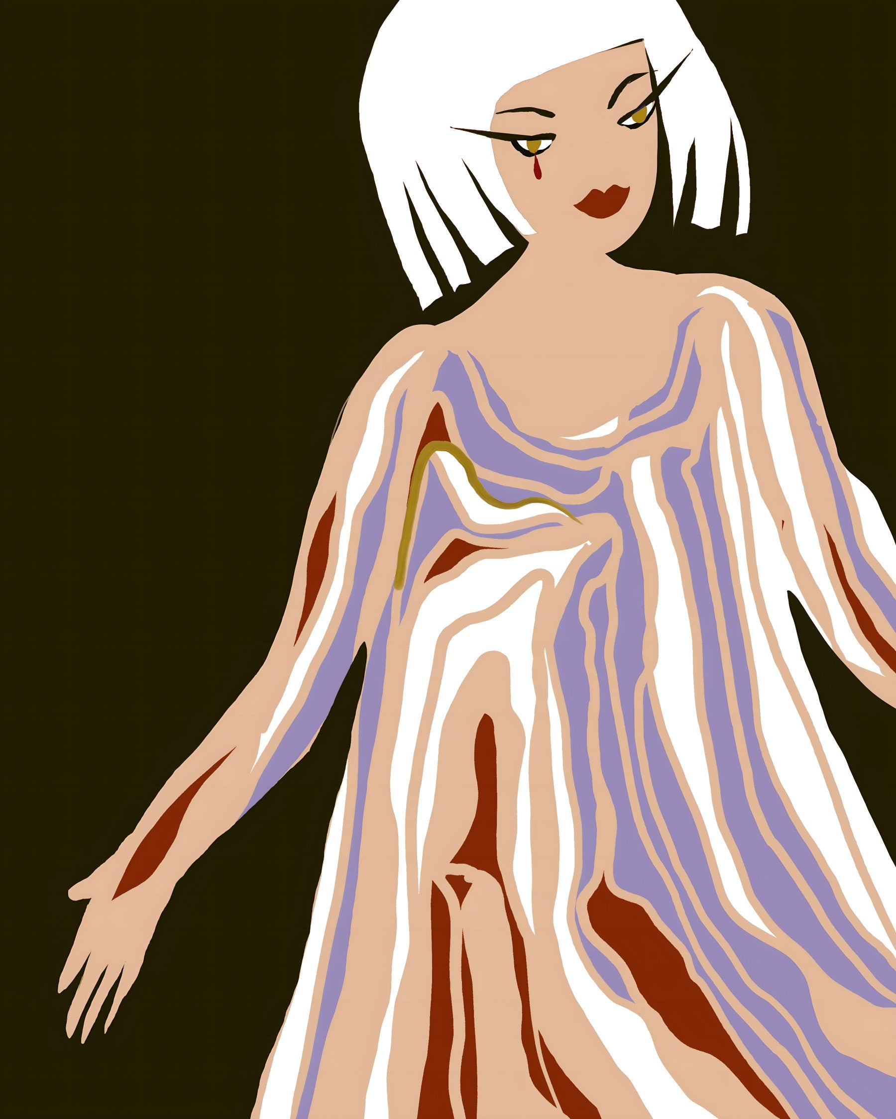 Modern illustration: white-haired figure in flowing gown; Retro Geo Blush wallpaper.