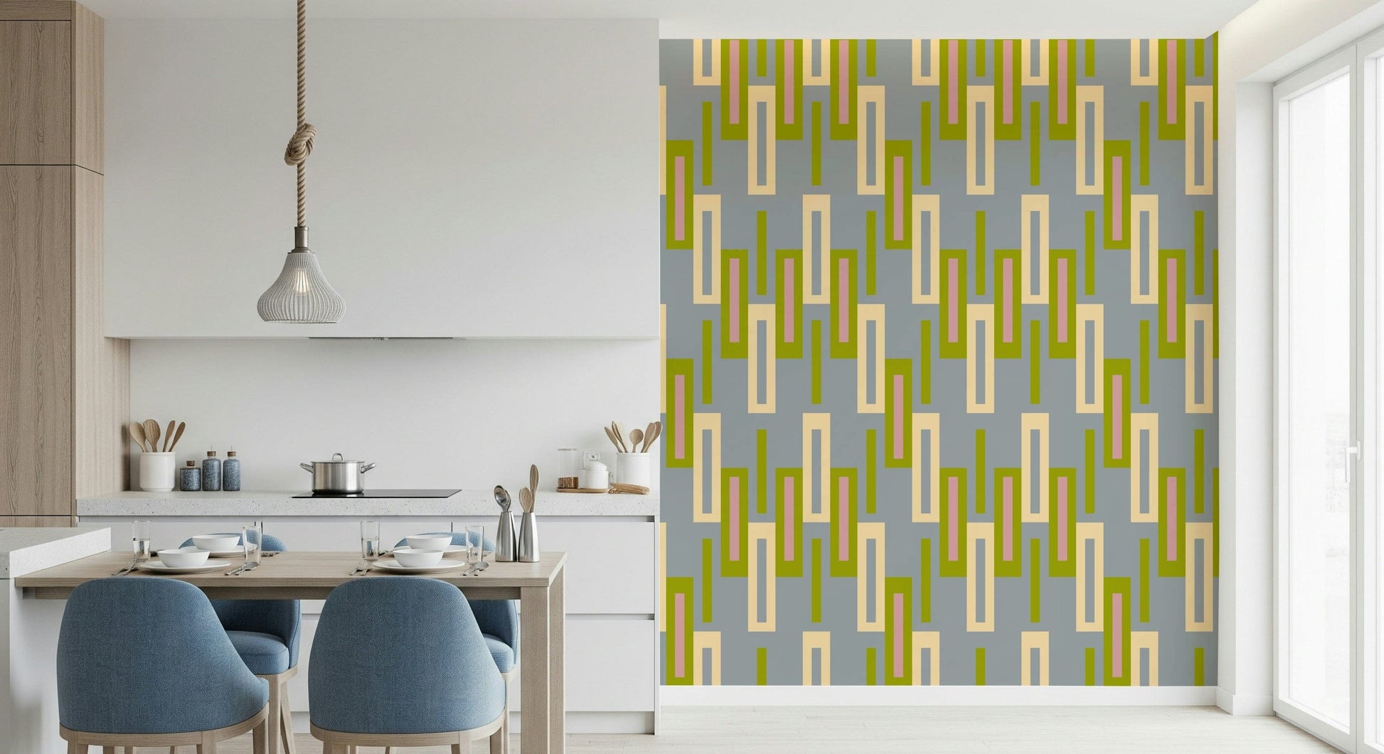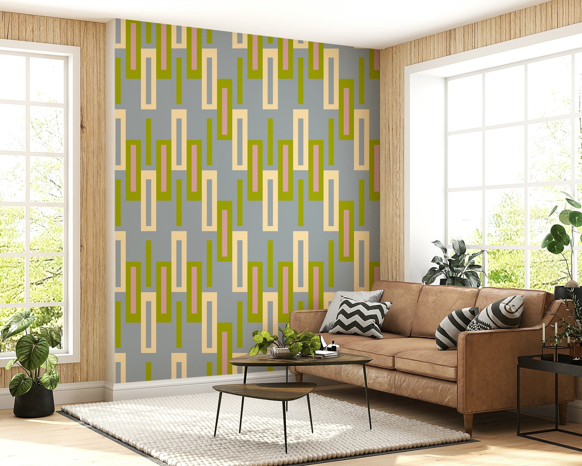 Step into a world of refined simplicity with "Moderno," a wallpaper that embodies contemporary elegance. This design features a captivating interplay of geometric shapes, creating a visually stimulating yet calming backdrop. Vertical lines of olive, creamy beige, and delicate blush dance against a soothing grey canvas, crafting a sophisticated rhythm that invigorates any space. The clean lines and muted palette perfectly complement modern interiors, adding a touch of understated luxury. “Moderno” invites you to embrace minimalist beauty and elevate your environment with its timeless charm. Perfect for offices, living rooms, or bedrooms seeking a contemporary yet welcoming aesthetic.