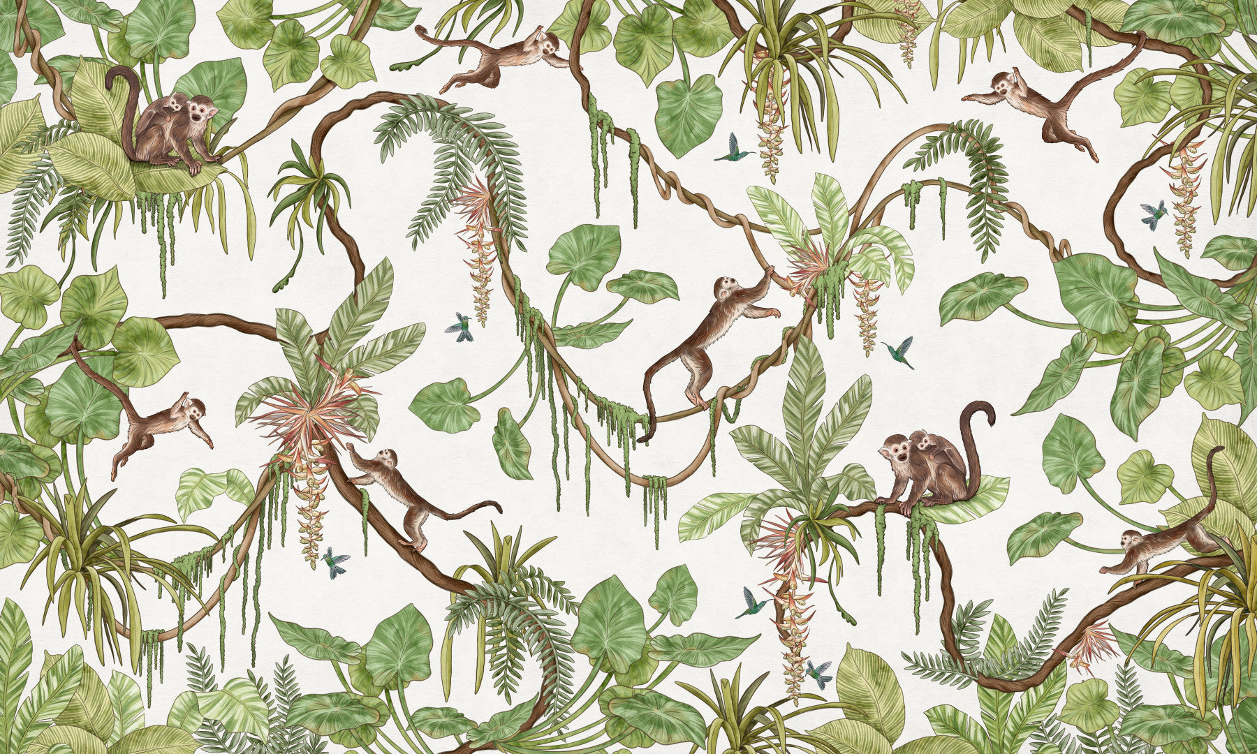 Playful tropical mural featuring monkeys swinging through trees – animal wallpaper, jungle wallpaper, tropical wallpaper.