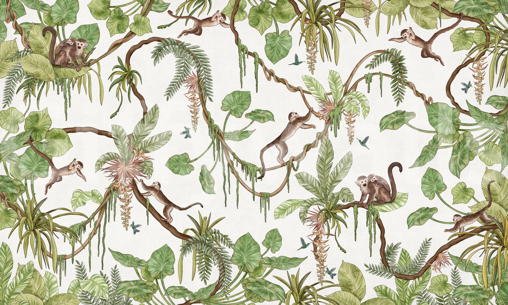 Transform your space with this whimsical tropical jungle scene. Agile monkeys swing through lush foliage, adding a touch of playful charm to any room. A light backdrop enhances the vibrant greens and earthy tones, creating a lively yet balanced aesthetic. This wallpaper for walls brightens playrooms, kids' bedrooms, or dining areas. Its detailed design invites the beauty of the rainforest into your home, complementing interiors with an adventurous spirit and natural elegance.