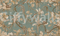 Exotic jungle wallpaper featuring monkeys resting among flowering branches