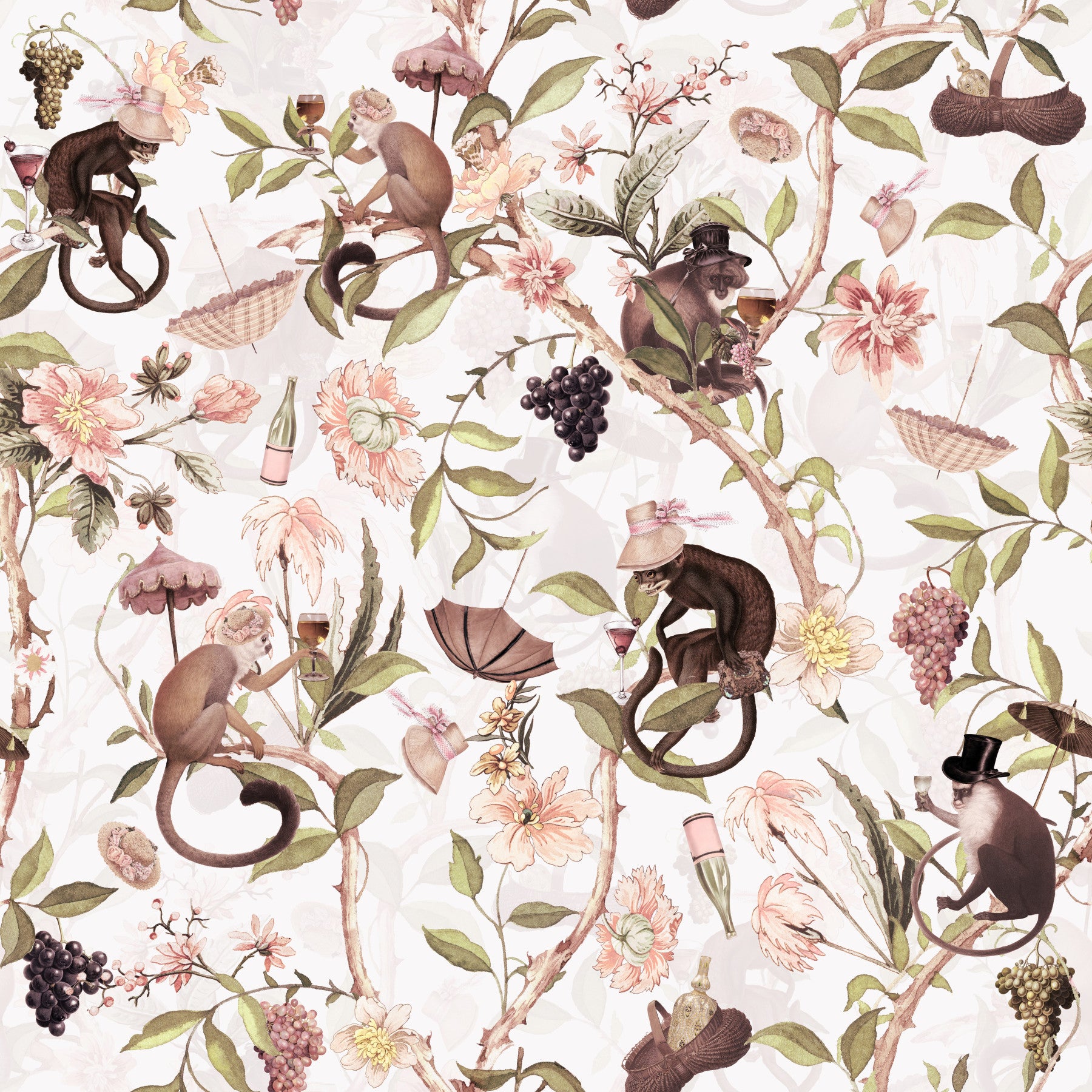 This exquisite wallpaper transports you to a whimsical tea party amidst a lush Chinoiserie garden. Elegant monkeys, adorned in charming hats, sip wine beneath parasols, surrounded by a profusion of delicate watercolor blooms and lush foliage. The soft, muted palette of pinks, greens, and browns creates a serene and sophisticated atmosphere, perfect for adding a touch of refined elegance to any room. The detailed botanical illustrations and playful monkey characters blend seamlessly, creating a captivating and unique design.