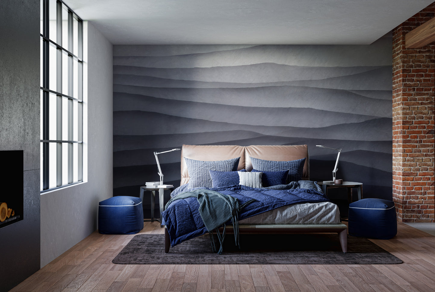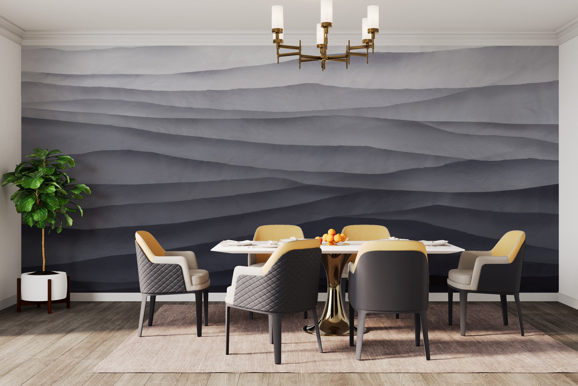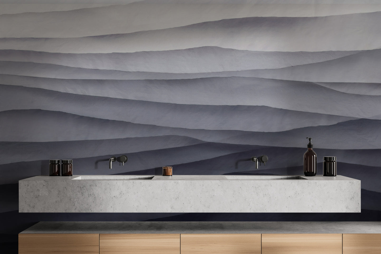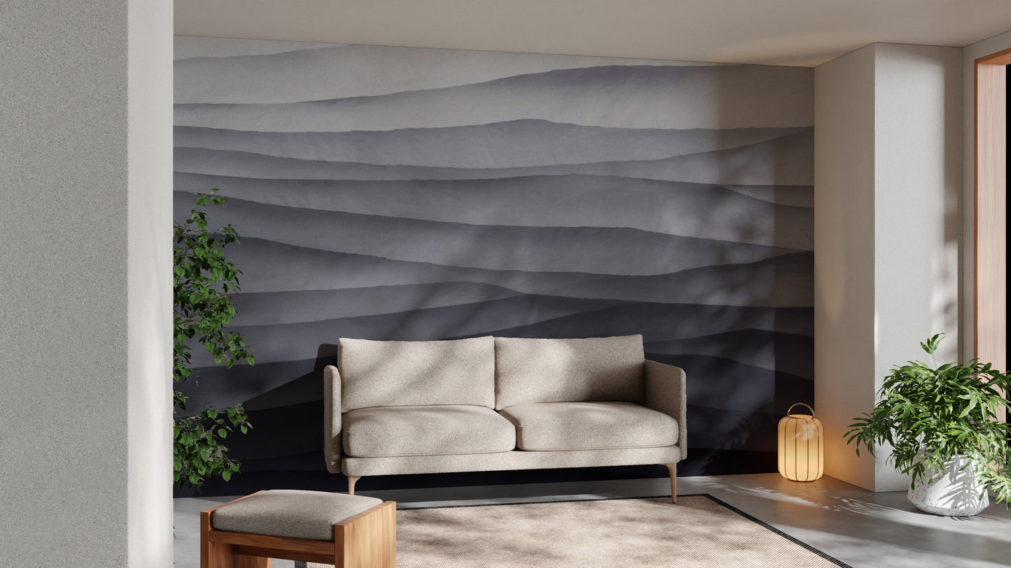 The monochrome abstract wallpaper mural brings modern elegance to any room. This abstract wallpaper mural features layered waves in soft grey and black tones and adds depth and texture to your walls. Its minimalist design makes it perfect for living rooms, bedrooms, or office spaces, blending effortlessly with contemporary interiors. The smooth gradient effect of this grey abstract wallpaper creates a striking visual without overwhelming the room. Ideal for those seeking a sophisticated, modern textured wallpaper look, this piece brings a refined touch to any setting. Make your walls stand out with this unique black and grey mural.