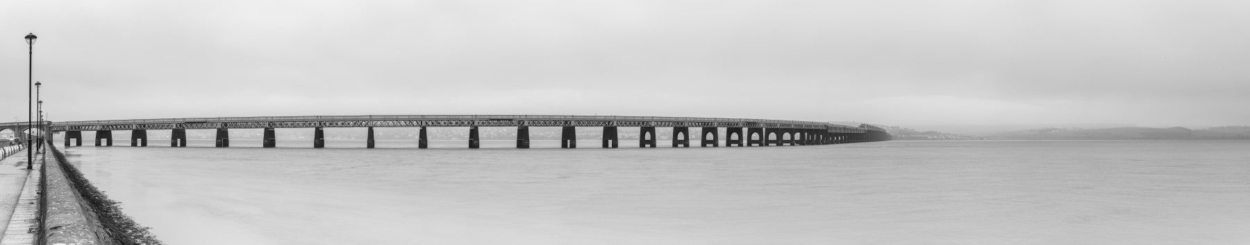 Tay Rail Bridge over river Tay, Dundee, Scotland. This monochrome wallpaper captures a stunning, long bridge stretching across calm waters under an overcast sky. The simple grayscale design evokes a peaceful, serene feeling. It creates a sophisticated, clean atmosphere. The neutral palette easily integrates with various décor styles. Consider this wallpaper for walls in a bedroom for a calming retreat. Or, incorporate it into an office for a minimalist, focused environment. It also works beautifully in a living room or hallway, providing a subtle, elegant backdrop that enhances any interior style.