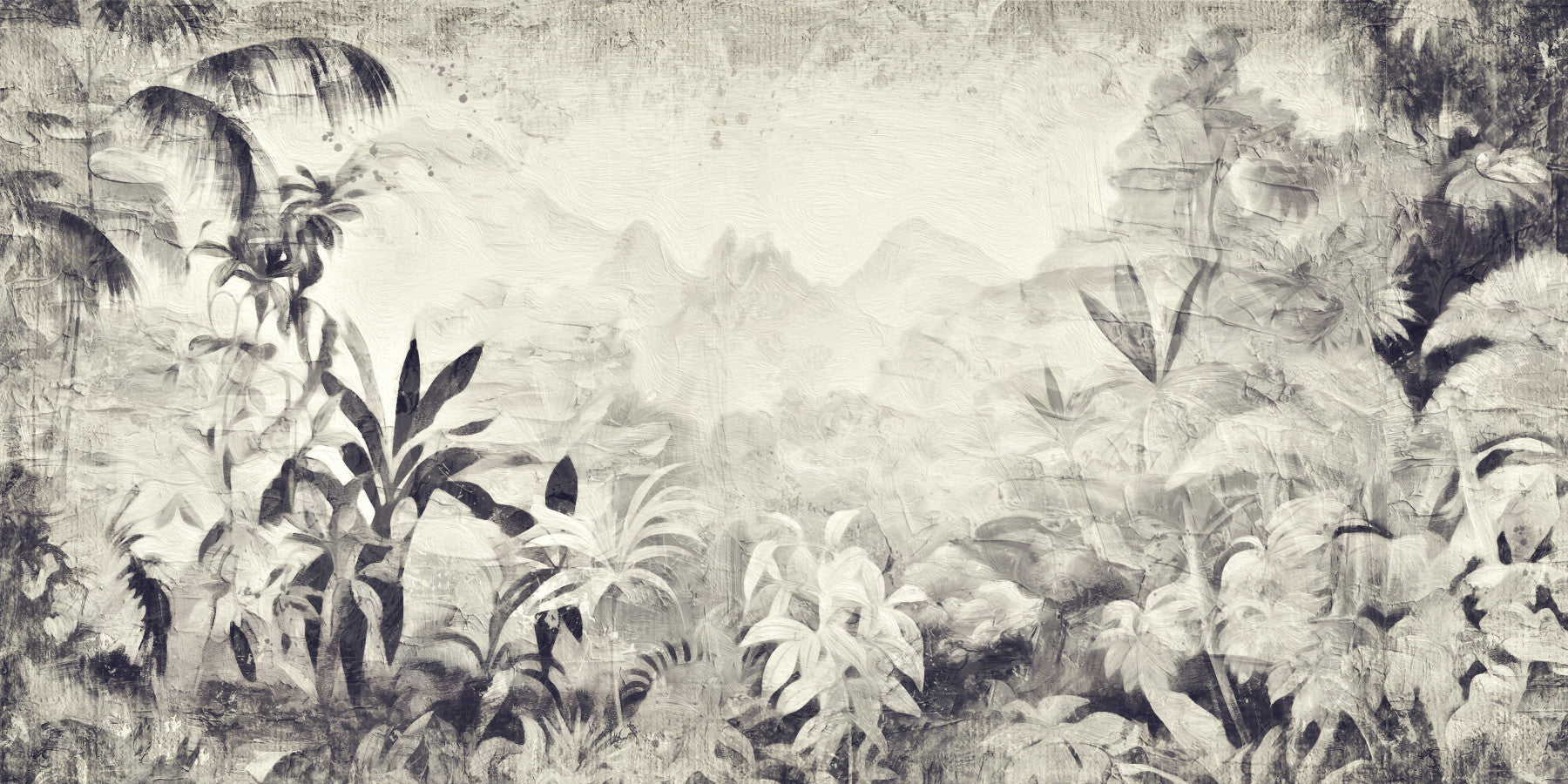 This elegant black and white jungle scene transforms any room into a tranquil escape. The design features detailed brushstrokes and overlapping foliage, creating a sense of depth and immersion. It's ideal for creating a calm atmosphere in bedrooms or living rooms, offering a timeless charm that blends well with various decor styles. Transform your living space effortlessly with this sophisticated wallpaper for walls. The muted tones also make it suitable for creating a relaxing study or a serene office environment.
