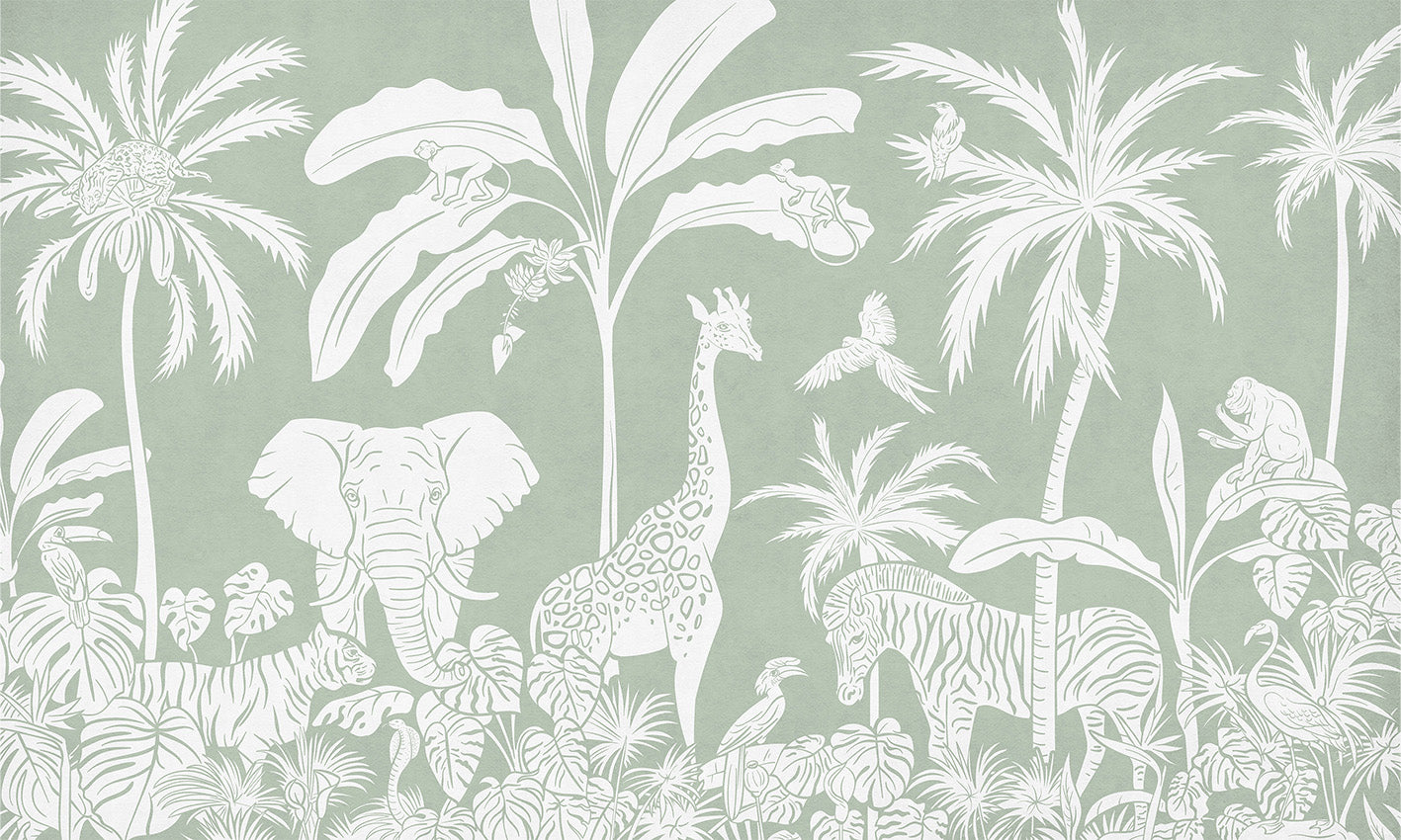 The monochrome jungle green wall mural is an excellent choice for your nursery room wallpaper. This unique design features detailed jungle animals and lush greenery in soothing monochrome tones. The soft green backdrop creates a calming atmosphere, ideal for your baby’s nursery. With elephants, giraffes, zebras, and more, this mural brings the wonder of the jungle right into your home. It's perfect for parents looking to add a touch of nature and adventure to their nursery. The intricate details of the animals will captivate your child’s imagination, making their nursery a magical place to grow and play. The mural is made of high-quality materials, ensuring durability and ease of maintenance.